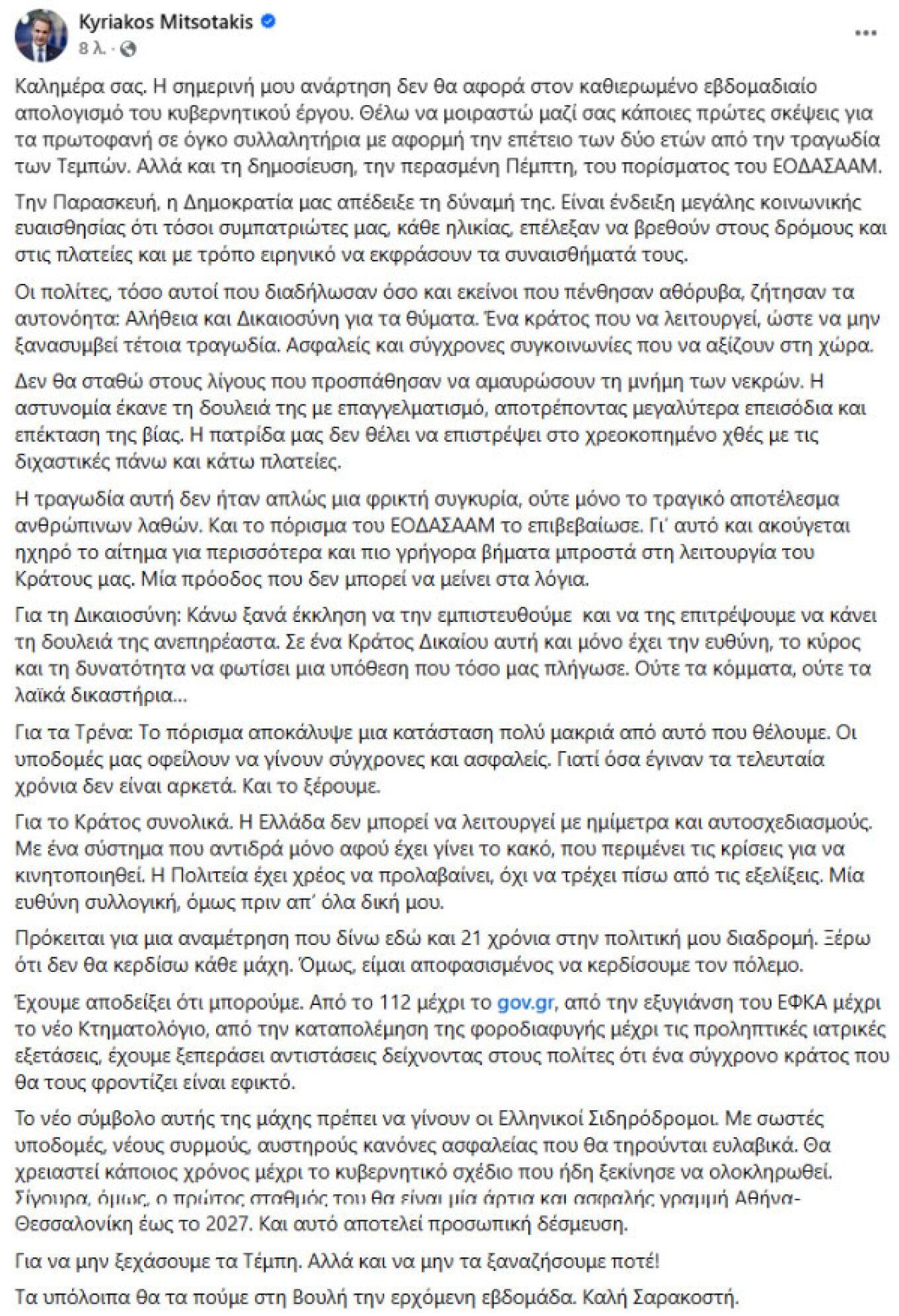 «Καλημέρα σας. Η σημερινή μου ανάρτηση δεν θα αφορά στον καθιερωμένο εβδομαδιαίο απολογισμό του κυβερνητικού έργου. Θέλω να μοιραστώ μαζί σας κάποιες πρώτες σκέψεις για τα πρωτοφανή σε όγκο συλλαλητήρια με αφορμή την επέτειο των δύο ετών από την τραγωδία των Τεμπών. Αλλά και τη δημοσίευση, την περασμένη Πέμπτη, του πορίσματος του ΕΟΔΑΣΑΑΜ.