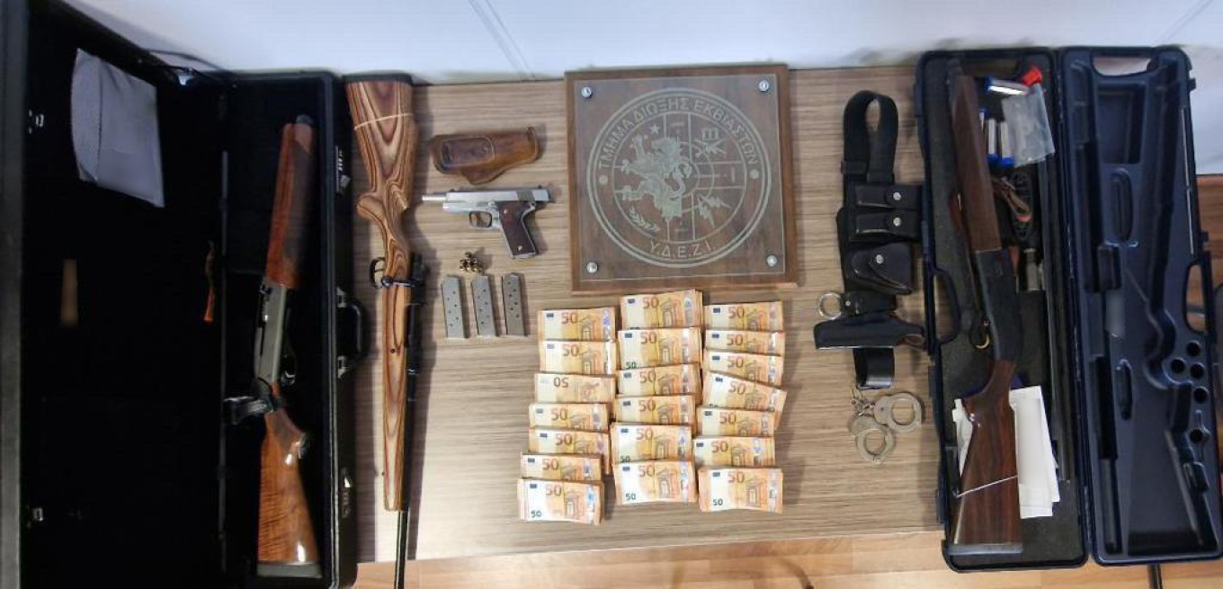 Στην κατοχή του καθώς και σε έρευνες που πραγματοποιήθηκαν σε οικίες, βρέθηκαν και κατασχέθηκαν: ένα κινητό τηλέφωνο, 100.000 ευρώ, δύο καραμπίνες, καραμπίνα άνευ αριθμού και λοιπών ενδείξεων, ένα πιστόλι, μια δερμάτινη ζώνη εξάρτησης, χειροπέδες, 3 μεταλλικοί γεμιστήρες, 7 φυσίγγια «Hollow point» και ένα όχημα.