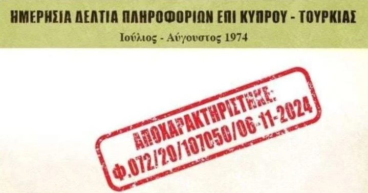 Αποχαρακτηρισμένα έγγραφα για την εισβολή στην Κύπρο δημοσιοποίησε σήμερα η Εθνική Υπηρεσία Πληροφοριών (ΕΥΠ). Τα έγγραφα αφορούν τα τραγικά γεγονότα του Ιουλίου και Αυγούστου του 1974 στην Κύπρο, τα οποία μέχρι πρότινος ήταν απόρρητα διαβαθμισμένα έγγραφα.