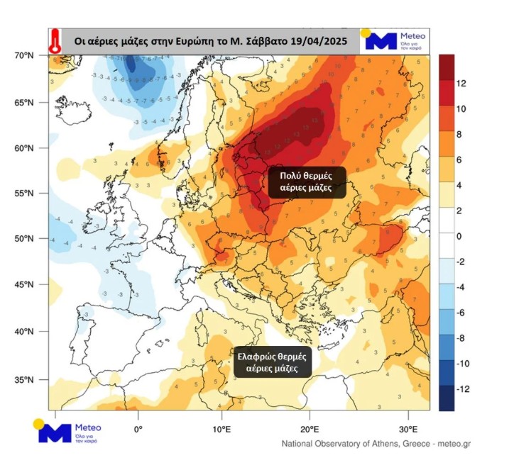 Στους προγνωστικούς χάρτες παρουσιάζεται η απόκλιση της θερμοκρασίας των αερίων μαζών σε ύψος 1500 μέτρων από τη μέση στάθμη της θάλασσας τη Μεγάλη Πέμπτη 17/04 και το Μεγάλο Σάββατο 19/04. Όπως διακρίνουμε, τη Μεγάλη Πέμπτη 17/04 οι αέριες μάζες θα είναι 6 με 8°C θερμότερες από τις κανονικές για την εποχή, ενώ το Μεγάλο Σάββατο 19/04 θα είναι 3 με 4°C θερμότερες από τις κανονικές για την εποχή.
