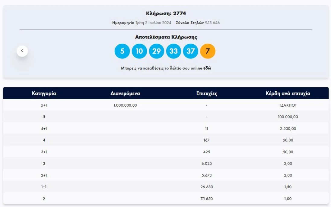 Τζακ ποτ σημειώθηκε στην πρώτη κατηγορία (5+1) του Τζόκερ στην κλήρωση 2724 της Τρίτης.