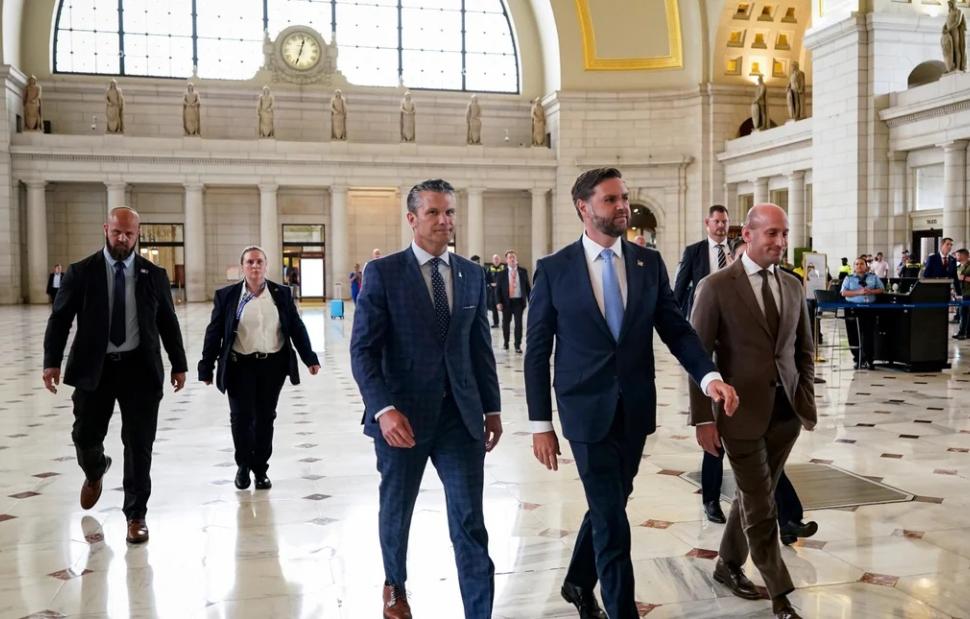 Μοιράζοντας μπέργκερ σε στρατιώτες που είχαν αναπτυχθεί την περασμένη εβδομάδα με εντολή του Ντόναλντ Τραμπ στο Shake Shack του σταθμού, μαζί με τον υπουργό Άμυνας Πιτ Χέγκσεθ και τον αναπληρωτή προσωπάρχη του Λευκού Οίκου, Στίβεν Μίλερ, ο αντιπρόεδρος των ΗΠΑ είπε στους στρατιώτες: «Εκτιμούμε ό,τι κάνετε» και υποστήριξε: «Φέραμε λίγη τάξη και τον νόμο πίσω».