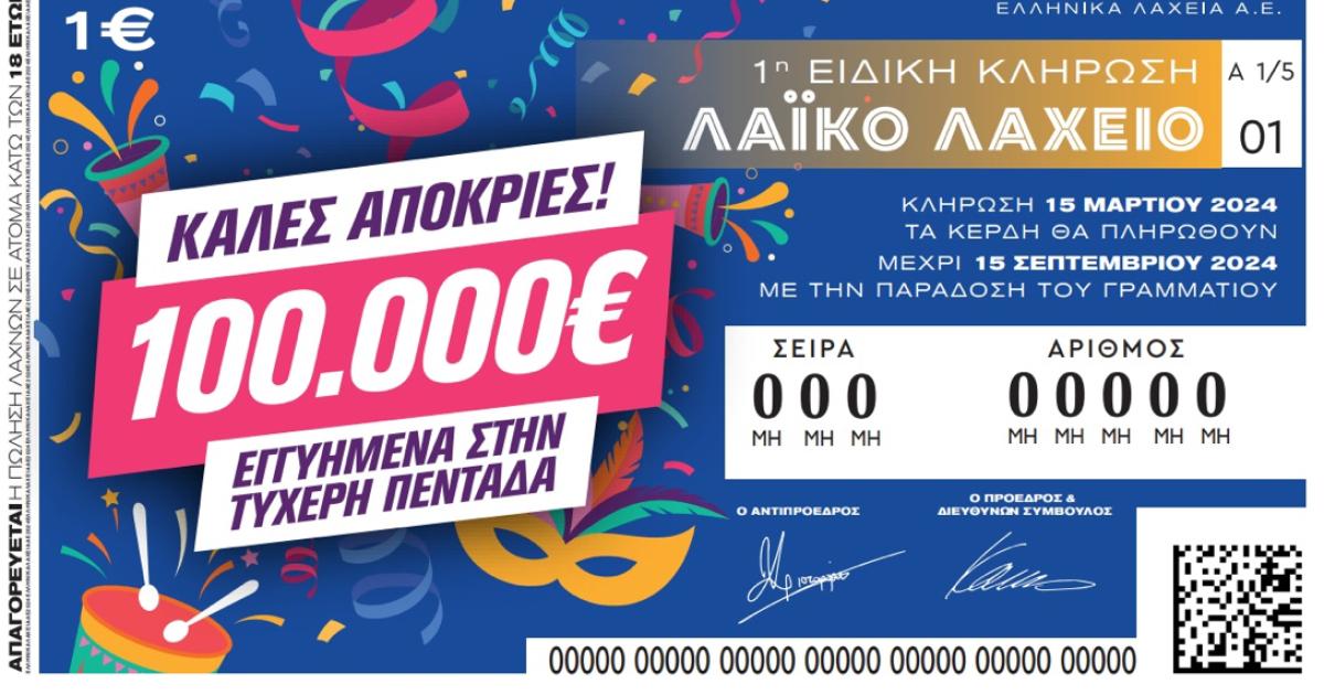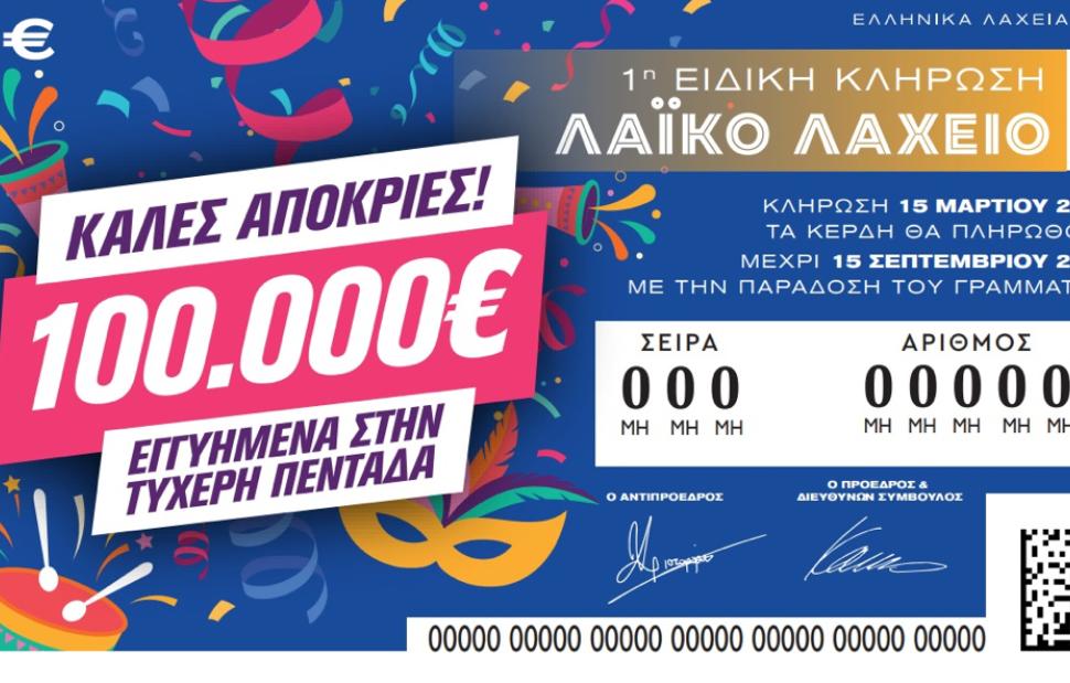 Η ειδική κλήρωση του Λαϊκού Λαχείου για το Καρναβάλι θα μεταδοθεί ζωντανά την Παρασκευή 15 Μαρτίου στις 19:00, από το κανάλι του ΟΠΑΠ στο YouTube.