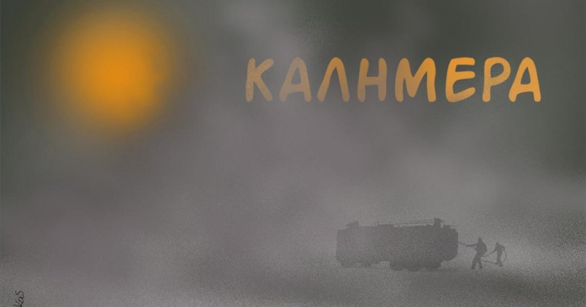 Στο σημερινό του σκίτσο, ο Αρκάς επιλέγει ένα σκοτεινό και βαριά φορτισμένο σκηνικό για να σχολιάσει την επικαιρότητα. Μέσα σε ένα γκριζωπό τοπίο, με τον ήλιο θαμπό και σχεδόν σβησμένο, ένα πυροσβεστικό όχημα και δύο πυροσβέστες δίνουν μάχη με τις φλόγες.