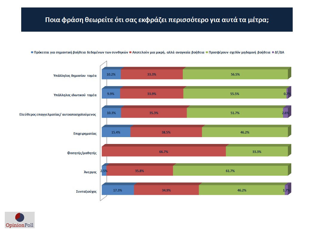 - Το 53% θεωρεί ότι τα μέτρα που έχει λάβει μέχρι τώρα η Κυβέρνηση προσφέρουν σχεδόν μηδαμινή βοήθεια. Το 35% θεωρεί ότι αποτελούν μια μικρή αλλά αναγκαία βοήθεια και το 11% τα θεωρεί ως μια σημαντική βοήθεια δεδομένων των συνθηκών. Αυξημένα εμφανίζονται τα ποσοστά όσων τα θεωρούν ως μηδενική βοήθεια στους εργαζόμενους του ιδιωτικού τομέα με 55.5% και στους ελεύθερους επαγγελματίες / αυτοαπασχολούμενους με 51.7%.