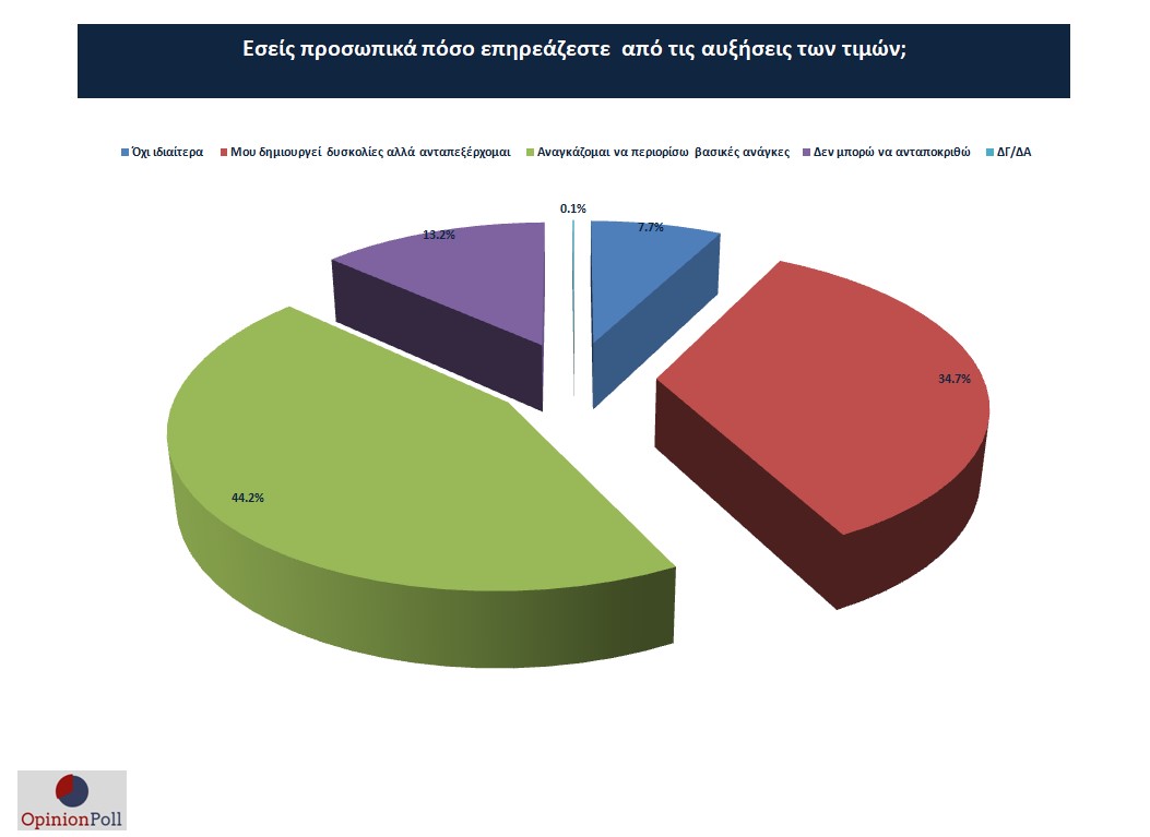 - Το 44% απαντά ότι λόγω της ακρίβειας αναγκάζεται να περιορίσει βασικές ανάγκες για να μπορέσει να ανταποκριθεί , ενώ το 13% δεν μπορεί να ανταποκριθεί. Παράλληλα το 35% δηλώνει ότι η ακρίβεια του δημιουργεί δυσκολίες, αλλά μπορεί να ανταποκριθεί , ενώ το 8% ότι δεν επηρεάζεται ιδιαίτερα. Το 45.3% των υπαλλήλων του ιδιωτικού τομέα , το 32.8% των ελεύθερων επαγγελματιών/ αυτοαπασχολούμενων και το 41.7% των επιχειρηματιών θεωρεί ότι τα μέτρα που έχουν ληφθεί προσφέρουν σχεδόν μηδαμινή βοήθεια.