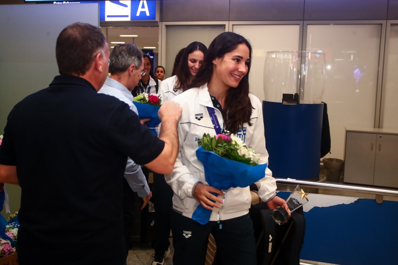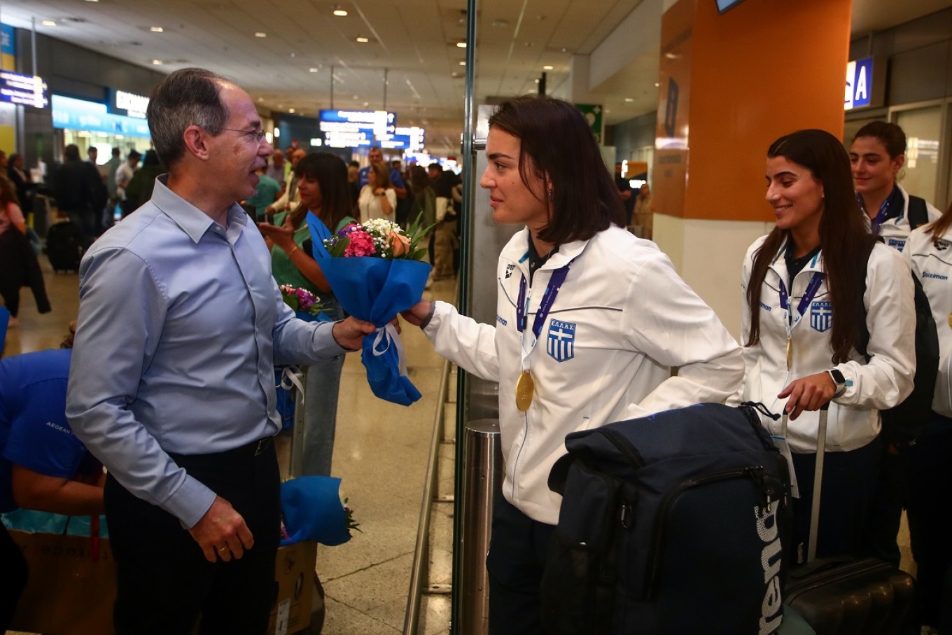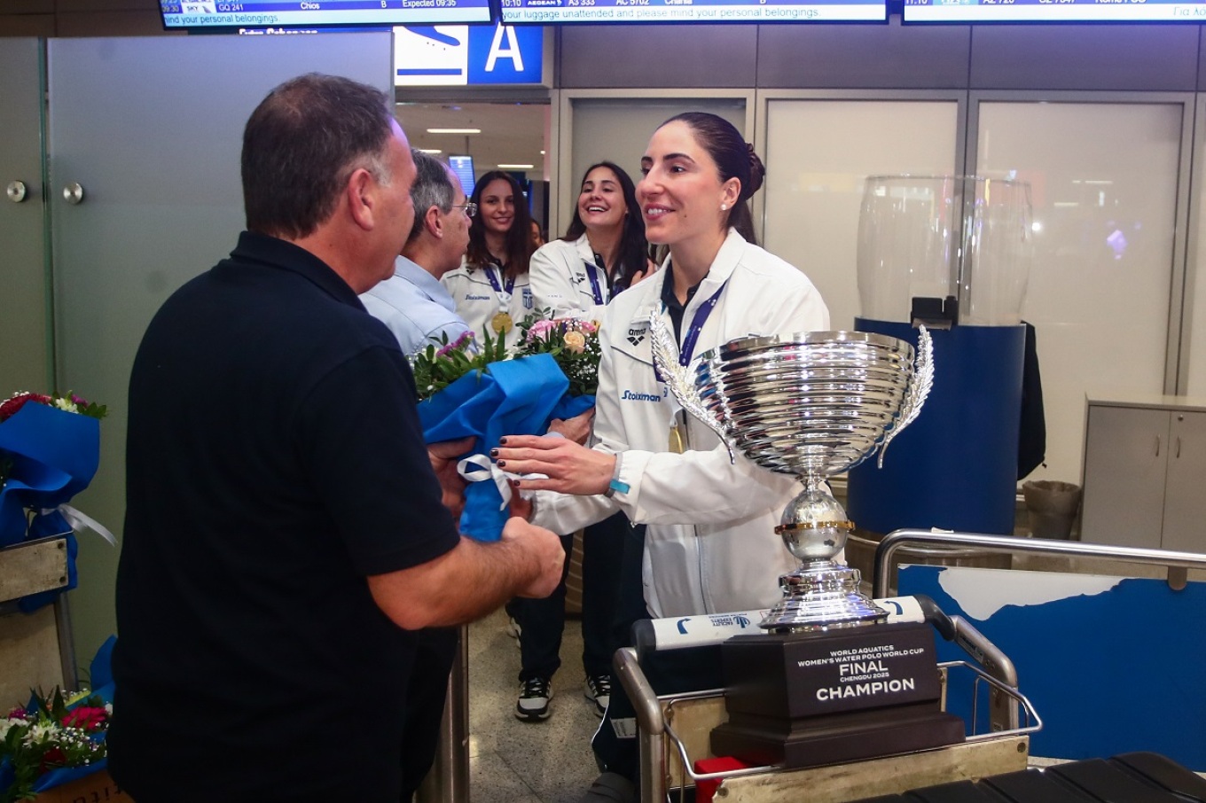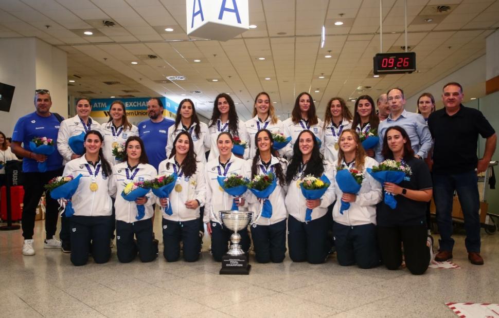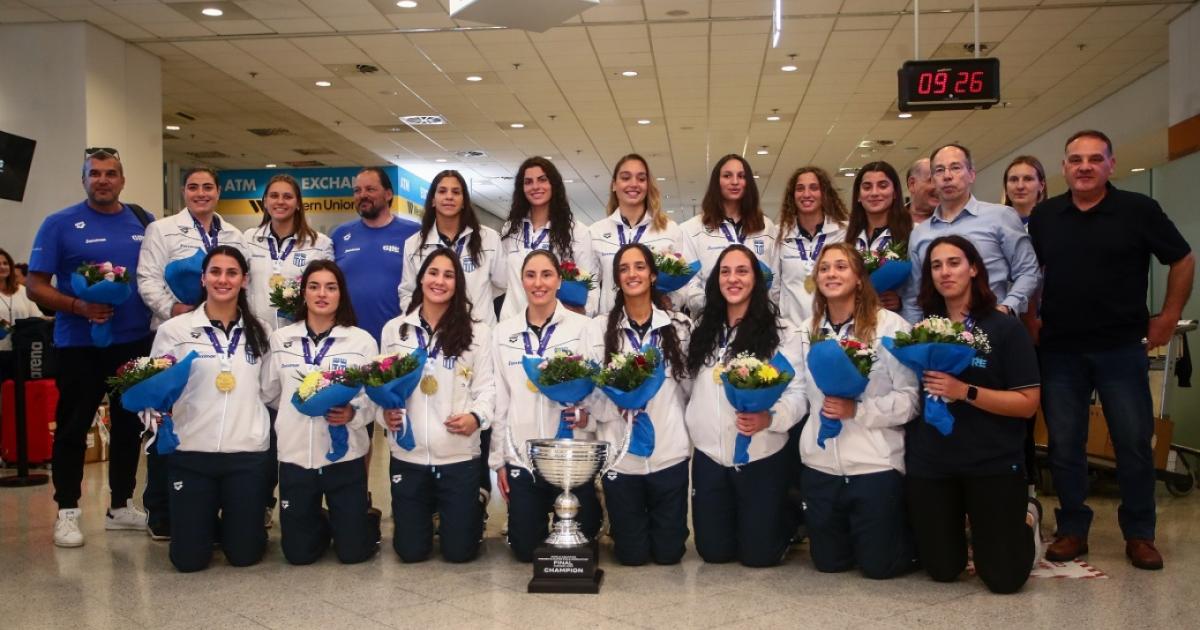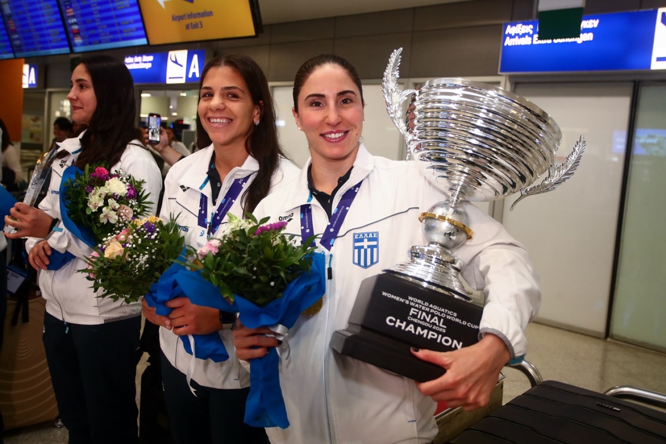 Στην Αθήνα επέστρεψαν τα «χρυσά» κορίτσια της Εθνικής ομάδας πόλο γυναικών, μια ημέρα μετά την κατάκτηση της πρώτης θέσης στο World Cup της Κίνας.