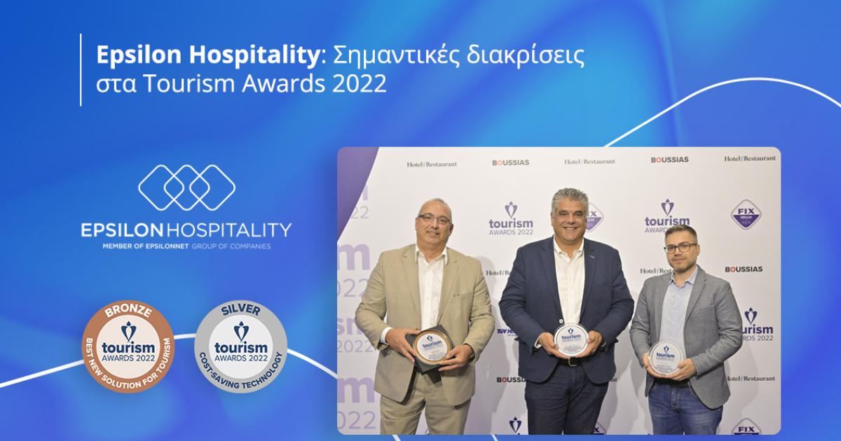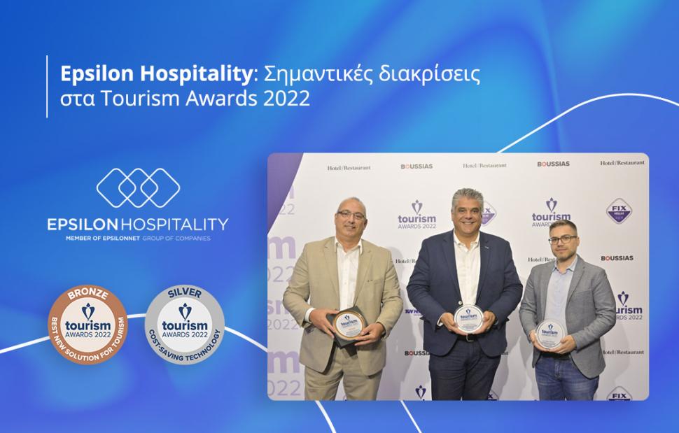 Η Epsilon Hospitality, η εξειδικευμένη θυγατρική του Ομίλου της Epsilon Net στον κλάδο της Φιλοξενίας & της Εστίασης έλαβε δύο νέες σημαντικές διακρίσεις, αυτή τη φορά στα Tourism Awards 2022, επιβεβαιώνοντας για ακόμα μια φορά την επιμονή του Ομίλου της Epsilon Net στους στόχους της καινοτομίας και της υψηλής ποιότητας των λύσεων της.