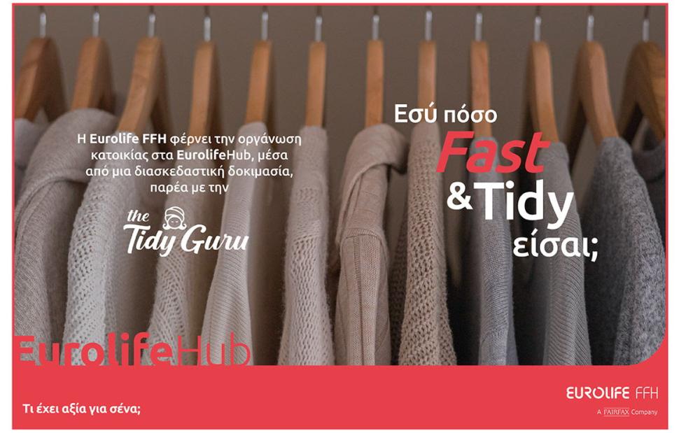 Η Eurolife FFH, μέλος της Fairfax Financial Holdings Ltd, στο πλαίσιο ενεργοποίησής της στα διαδραστικά σημεία ενημέρωσης και εμπειρίας EurolifeHub, παρουσιάζει τη νέα δράση “Fast & Tidy”, με θέμα την οργάνωση του σπιτιού. Σε συνεργασία με τη γνωστή content creator στον τομέα της οργάνωσης κατοικίας, The Tidy Guru, προσκαλεί τους επισκέπτες των EurolifeHub στα εμπορικά κέντρα της LAMDA Development, The Mall Athens και Golden Hall στην Αθήνα και Mediterranean Cosmos στη Θεσσαλονίκη, σε ένα πρωτότυπο και διασκεδαστικό challenge: να διπλώσουν όσα περισσότερα μπλουζάκια μπορούν, μέσα σε 1,5 λεπτό, με τη βοήθεια ενός διπλωτικού! Κάθε μέρα ενεργοποίησης, σε κάθε εμπορικό κέντρο, ένας τυχερός θα κερδίζει από έναν ατμοκαθαριστή, ενώ στο τέλος του “Fast & Tidy” challenge ένας μεγάλος νικητής θα κερδίσει μια οργάνωση σπιτιού από την The Tidy Guru.