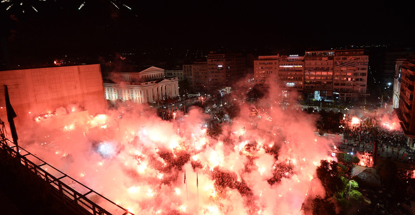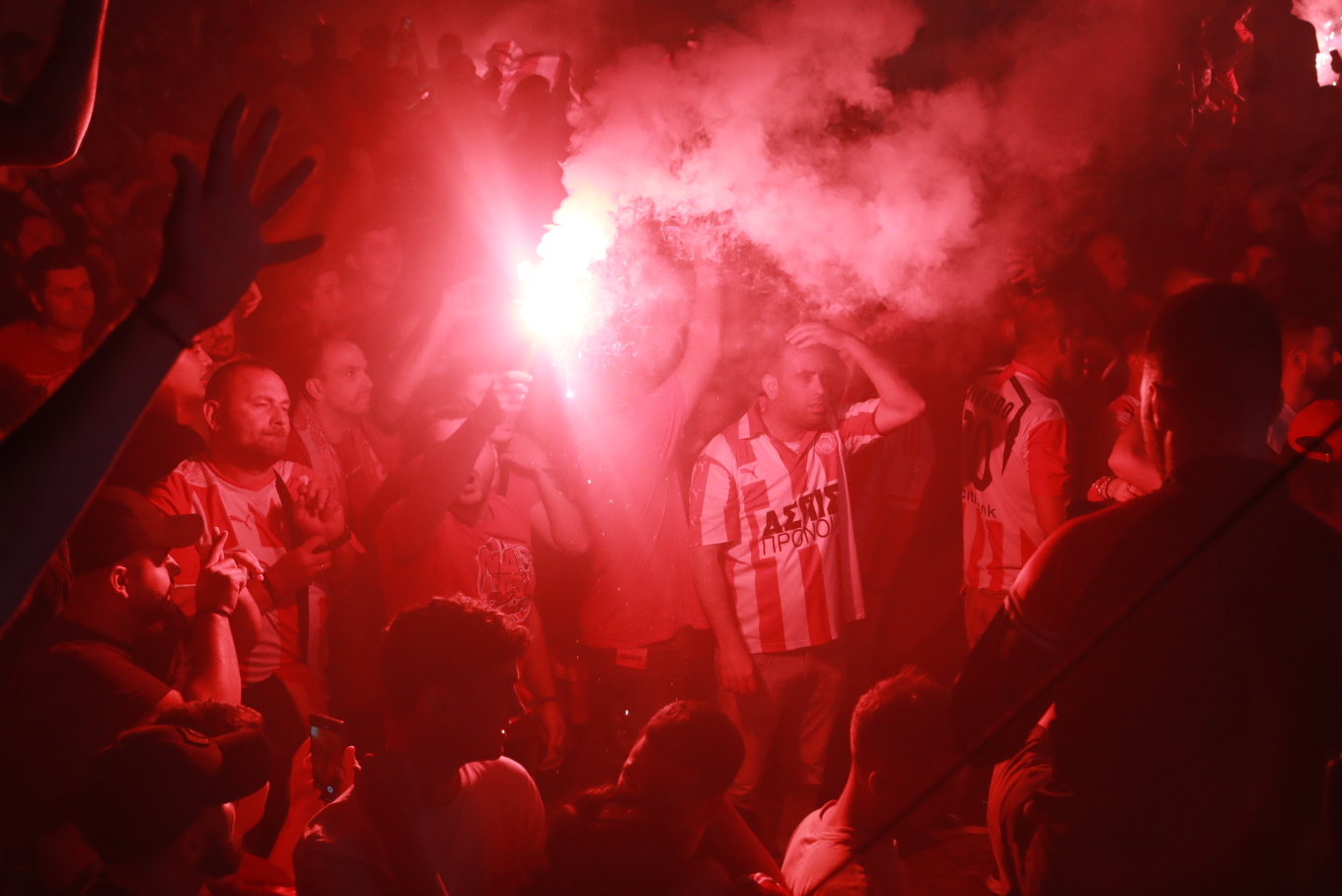 Με το που σφύριξε ο Πορτογάλος διαιτητής τη λήξη του τελικού χιλιάδες φίλοι των ερυθρόλευκων που παρακολουθούσαν το παιχνίδι από τις γιγαντοοθόνες που είχαν στηθεί σε τρεις περιοχές του Πειραιά ξέσπασαν σε ξέφρενους πανηγυρισμούς με τη νύχτα να γίνεται ημέρα.