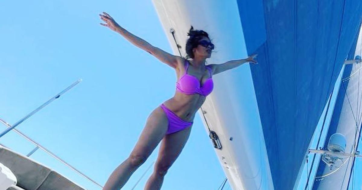 Η Σάλμα Χάγιεκ φοράει ένα μοβ μπικίνι και ο Γάλλος σύζυγός της χαμογελάει καθώς την βλέπει να χορεύει πάνω στο τραπέζι του σκάφους.