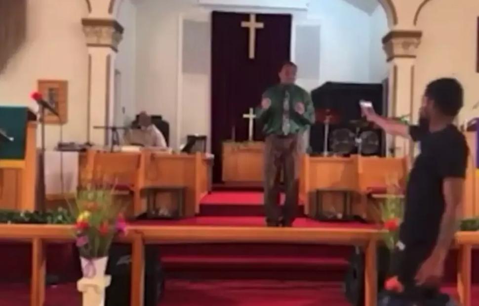Η σοκαριστική στιγμή καταγράφηκε σε βίντεο που τράβηξε ο διάκονος της εκκλησίας και αναρτήθηκε στο διαδίκτυο από τον ίδιο τον πάστορα. Στα πλάνα φαίνεται η στιγμή που ο πάστορας βρέθηκε ξαφνικά να κοιτάζει την κάννη ενός όπλου.