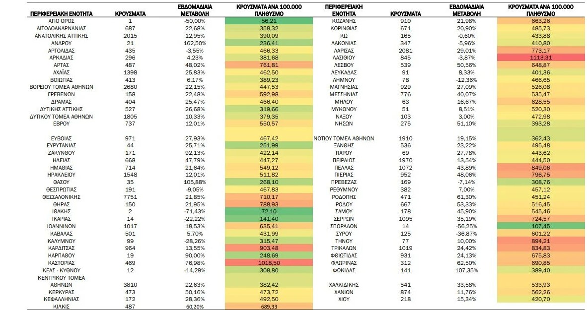 Στον Πίνακα 1 παρουσιάζεται τo σύνολο των κρουσμάτων, η επίπτωση ανά 100.000 πληθυσμού, καθώς και η εβδομαδιαία μεταβολή των επιβεβαιωμένων κρουσμάτων κορωνοϊού ανά περιφερειακή ενότητα την εβδομάδα αναφοράς σε σύγκριση με την προηγούμενη εβδομάδα.