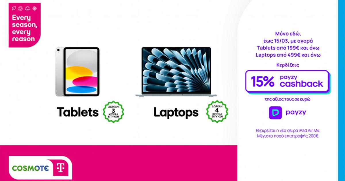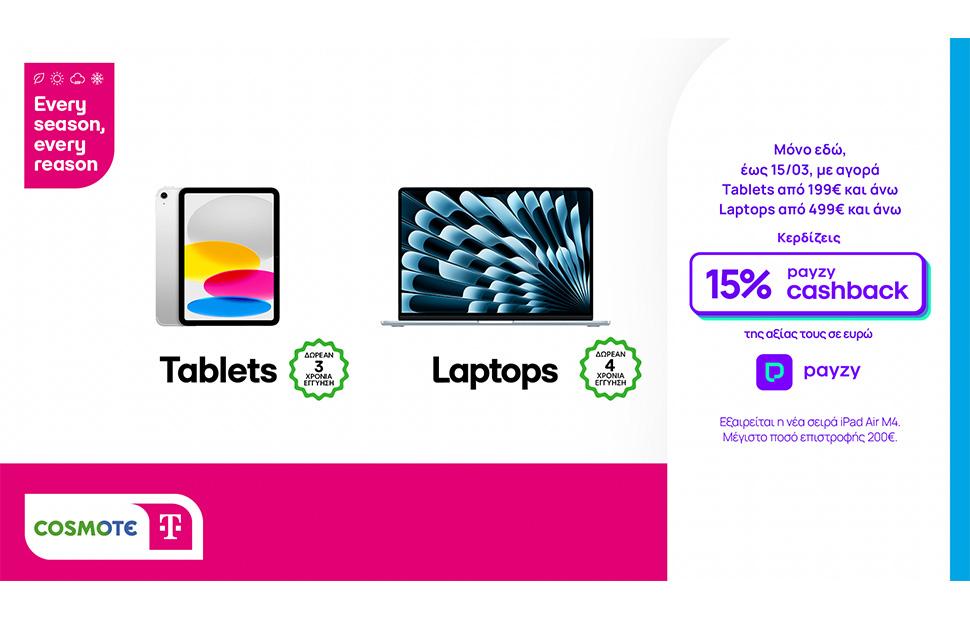 15% επιστροφή της αξίας των αγορών τους σε ευρώ (cashback) κερδίζουν οι καταναλωτές που θα αποκτήσουν tablet ή και laptop με κάρτα payzy στα καταστήματα της COSMOTE TELEKOM και ΓΕΡΜΑΝΟΣ σε όλη την Ελλάδα, αλλά και στα cosmote.gr και germanos.gr. Η προσφορά ισχύει μέχρι και τις 15 Μαρτίου 2026, για κάθε αγορά tablet αξίας 199€ και άνω και laptop αξίας 499€ και άνω.