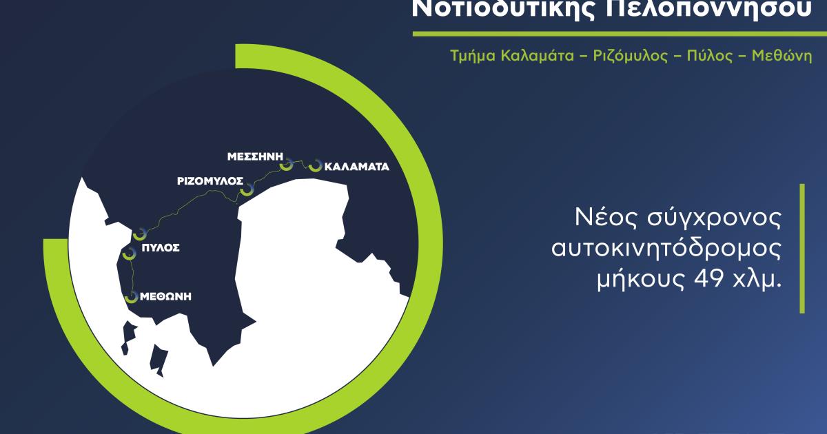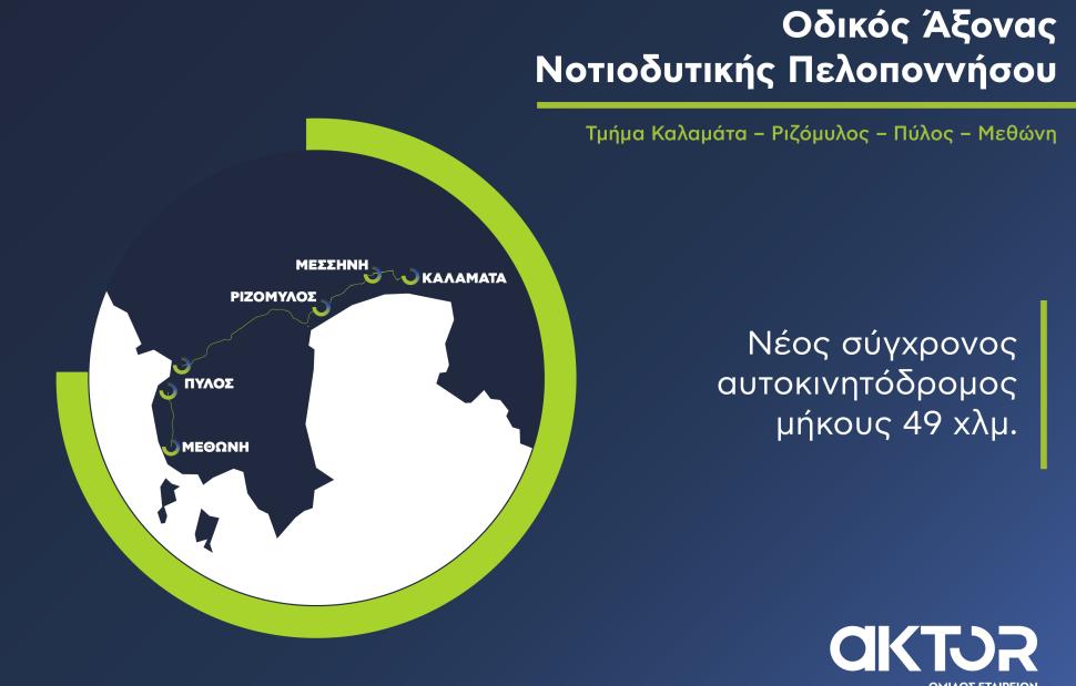 Σε πλήρη εξέλιξη βρίσκεται το σημαντικό έργο «Μελέτη, Κατασκευή, Χρηματοδότηση, Λειτουργία και Συντήρηση του Οδικού Άξονα Νοτιοδυτικής Πελοποννήσου, Τμήμα Καλαμάτα – Ριζόμυλος – Πύλος – Μεθώνη» που υλοποιεί ο Όμιλος AKTOR με τη μέθοδο της Σύμπραξης Δημοσίου και Ιδιωτικού Τομέα (ΣΔΙΤ).