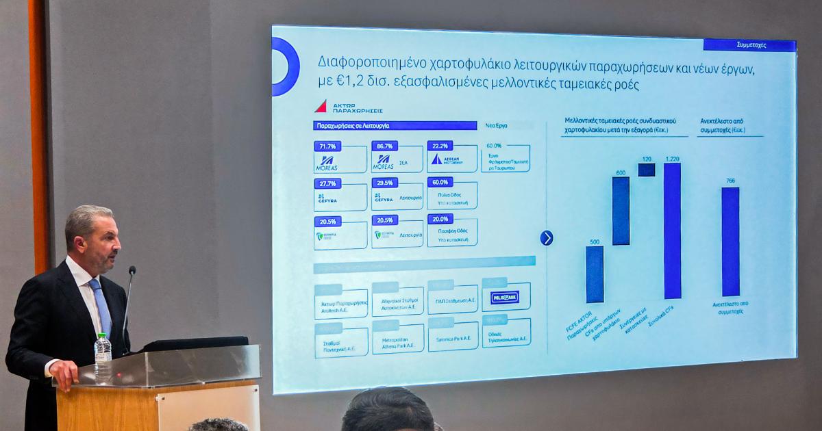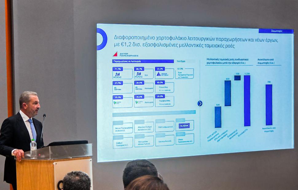 Ο κ. Εξάρχου σημείωσε ότι η ολοκλήρωση της εξαγοράς της ΑΚΤΩΡ Παραχωρήσεις διασφαλίζει, συνδυαστικά με το υφιστάμενο χαρτοφυλάκιο έργων ΣΔΙΤ και Παραχώρησης του Ομίλου, ροές ύψους €1,2 δισ. σε βάθος χρόνου, αλλά και ανεκτέλεστο ύψους €760 εκατ. για την εταιρεία από τον κλάδο παραχωρήσεων. Επισήμανε, μάλιστα, ότι με την ένταξη της ΑΚΤΩΡ Παραχωρήσεις στον Όμιλο, αλλά κυρίως λόγω της γενικότερης ανάπτυξής του, αναθεωρούνται προς το καλύτερο οι στόχοι της εταιρείας, καθώς επιτυγχάνεται (με αναγωγή σε ετήσια βάση) EBITDA ύψους €210 εκατ. για το 2025 και €460 εκατ. για το 2030, αντίστοιχα.