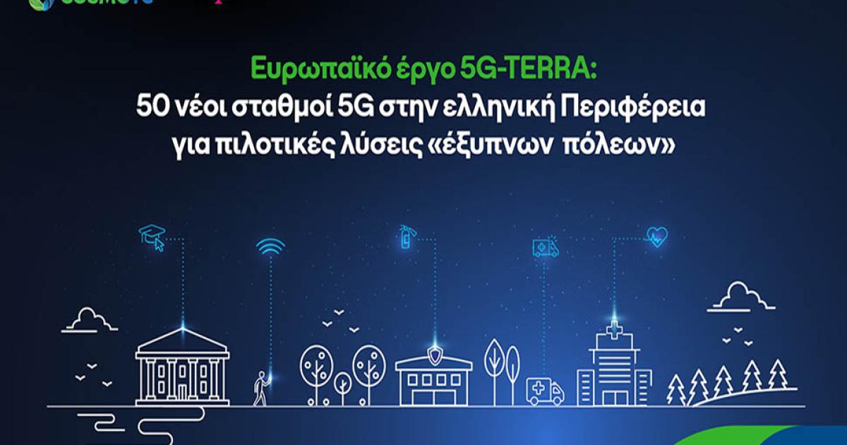 Την επέκταση του 5G δικτύου της με πενήντα επιπλέον σταθμούς βάσης στην ελληνική περιφέρεια, υλοποιεί η COSMOTE, στο πλαίσιο της συμμετοχής της στο ευρωπαϊκό έργο 5G-TERRA, για την ενεργοποίηση πιλοτικών υπηρεσιών κοινής ωφέλειας, στους τομείς της Υγείας, της Εκπαίδευσης και της Πολιτικής Προστασίας, συμβάλλοντας στην ψηφιακή αναβάθμιση των τοπικών κοινωνιών.