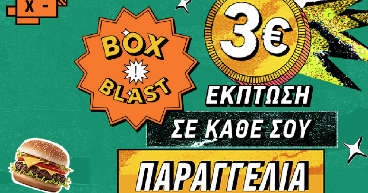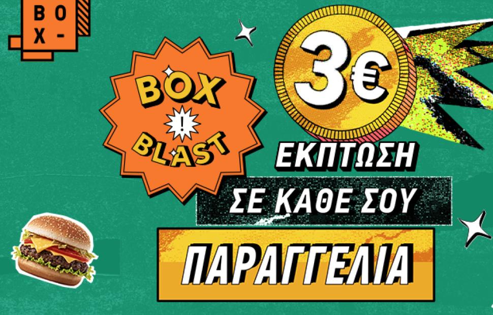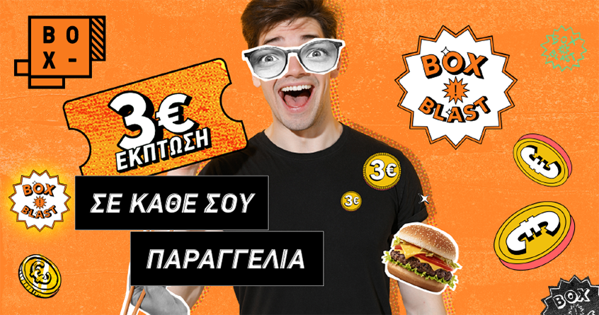 Έκπτωση 3€ σε κάθε παραγγελία φαγητού, καφέ ή και γλυκού προσφέρει τo BOX σε όλους τους χρήστες του, με την προσφορά ΒΟΧ BLAST. Για ακόμα μία φορά οι πελάτες του BOX κερδίζουν διπλά, και σε απόλαυση και σε οικονομία.
