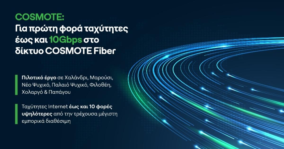 Ασύλληπτες ταχύτητες έως και 10Gbps μέσω οπτικών ινών φέρνει για πρώτη φορά η COSMOTE στο δίκτυο COSMOTE Fiber, υλοποιώντας πιλοτικό έργο σε περιοχές της Αττικής, όπως Χαλάνδρι, Μαρούσι, Νέο Ψυχικό, Παλαιό Ψυχικό, Φιλοθέη, Χολαργό και Παπάγου. Το έργο αυτό αποτελεί ακόμα μια απόδειξη ότι ο Όμιλος ΟΤΕ επενδύει εντατικά, όχι μόνο στην επέκταση αλλά και στη συνεχή αναβάθμιση του COSMOTE Fiber, του μεγαλύτερου δικτύου οπτικών ινών στη χώρα, που έχει παρουσία σε 145 δήμους από όλη την Ελλάδα.