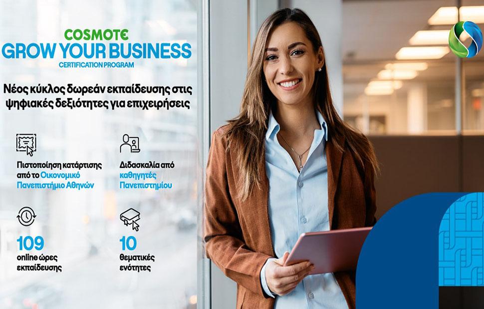 Με νέο κύκλο μαθημάτων ξεκινά το δωρεάν εκπαιδευτικό πρόγραμμα ψηφιακών δεξιοτήτων για επιχειρήσεις COSMOTE GROW YOUR BUSINESS – Certification Program. Τo πρόγραμμα υλοποιείται για δεύτερη συνεχή χρονιά και απευθύνεται σε όλες τις ελληνικές μικρομεσαίες επιχειρήσεις, τους εργαζομένους τους και τους ελεύθερους επαγγελματίες που επιθυμούν να εκπαιδευτούν πάνω σε ψηφιακά εργαλεία και υπηρεσίες, που συμβάλλουν στην εξωστρέφεια, την ανταγωνιστικότητα και την ανάπτυξή τους. Επιπλέον, συμβάλλει σημαντικά στην εφαρμογή βιώσιμων πρακτικών στις επιχειρήσεις. Οι συμμετέχοντες έχουν τη δυνατότητα να αποκτήσουν πιστοποιητικό κατάρτισης από το Κέντρο Επιμόρφωσης και Δια Βίου Μάθησης (ΚΕΔΙΒΙΜ) του Οικονομικού Πανεπιστημίου Αθηνών.