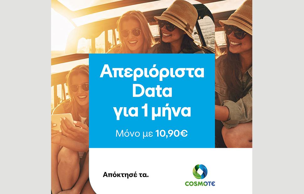 Με στόχο να απολαύσουν τις δυνατότητες του βραβευμένου δικτύου της και φέτος το καλοκαίρι, η COSMOTE προσφέρει σε όλους τους συνδρομητές της απεριόριστα data για 30 ημέρες με €10,90. Για να μπορούν να σερφάρουν online, να ψυχαγωγούνται και να εργάζονται ξέγνοιαστα, όπου κι αν βρίσκονται.