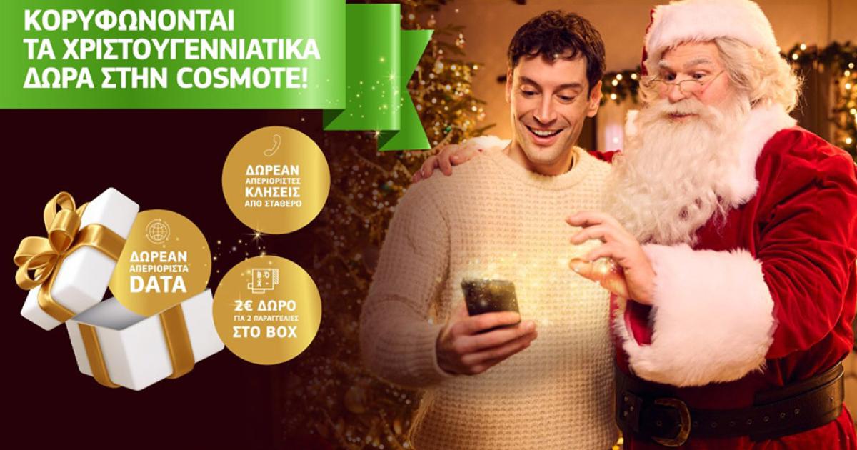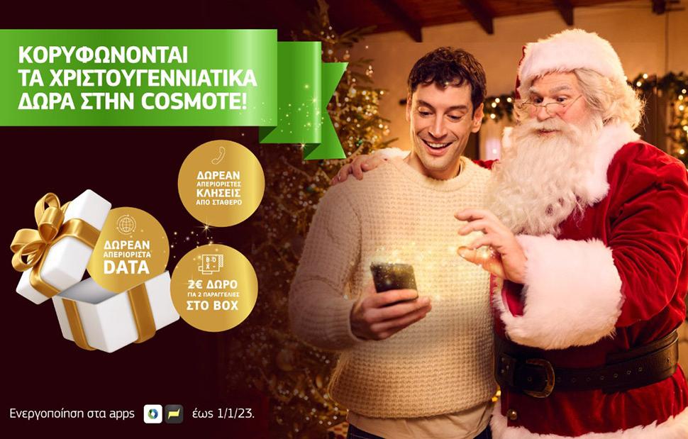 Δωρεάν απεριόριστα data και δωρεάν απεριόριστες κλήσεις από σταθερό προσφέρει η COSMOTE για την περίοδο των Χριστουγέννων και της Πρωτοχρονιάς σε όλους τους συνδρομητές της, οικιακούς και εταιρικούς. Με τη νέα αυτή προσφορά, που ισχύει μέχρι και την 1η Ιανουαρίου 2023, κορυφώνονται τα χριστουγεννιάτικα δώρα της COSMOTE προς τους συνδρομητές της.