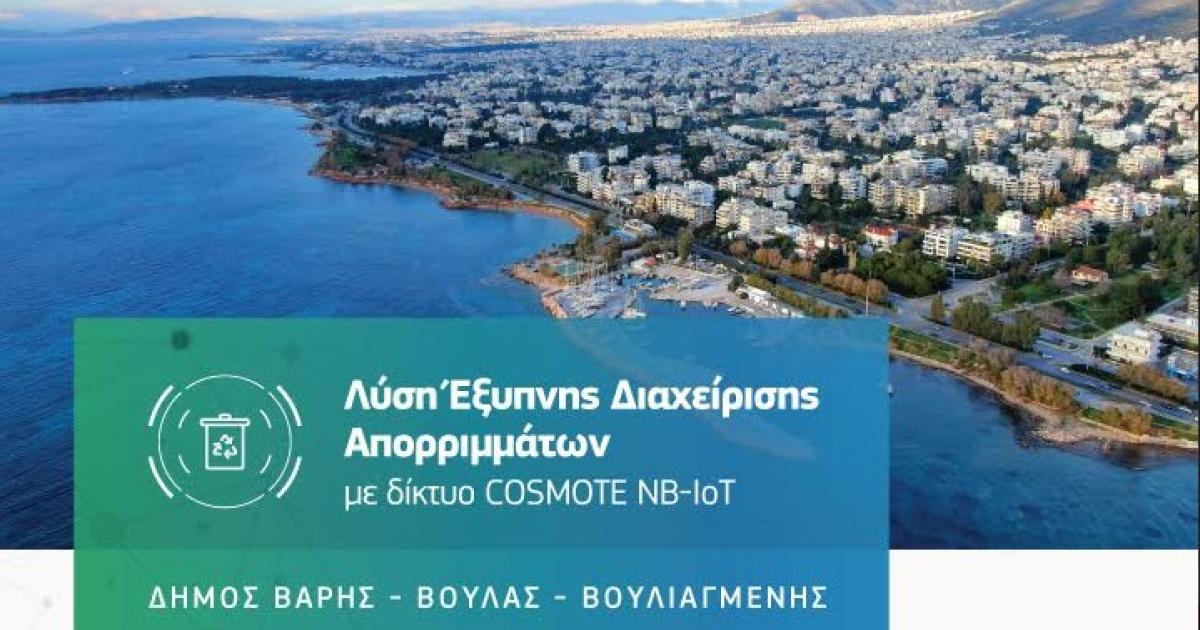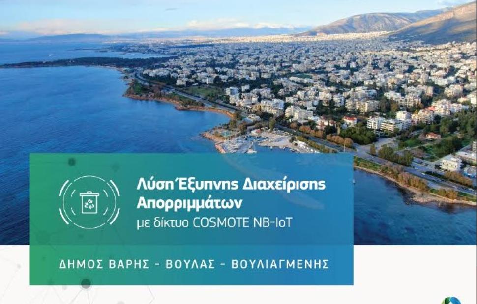 Την COSMOTE επέλεξε ο Δήμος Βάρης Βούλας Βουλιαγμένης, μετά από διεθνή ηλεκτρονικό διαγωνισμό, για την προμήθεια και εφαρμογή συστήματος έξυπνων κάδων αποκομιδής απορριμμάτων. Με την «έξυπνη» διαχείριση απορριμμάτων βελτιώνεται η καθημερινότητα των κατοίκων, ενώ ο Δήμος εξοικονομεί πολύτιμους πόρους και μειώνει τις δαπάνες. Η λύση αξιοποιεί την τεχνολογία Narrow-Band Internet of Things (NB-IoT), καθώς απαιτεί μικρό όγκο δεδομένων για τη διασύνδεση συσκευών μέσω δικτύου κινητής, μειώνοντας δραστικά την κατανάλωση ενέργειας και το κόστος.