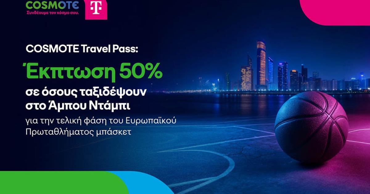 Έκπτωση 50% στην υπηρεσία COSMOTE Travel Pass προσφέρει η COSMOTE TELEKOM σε όσους συνδρομητές ταξιδέψουν στα Ηνωμένα Αραβικά Εμιράτα για να απολαύσουν από κοντά την τελική φάση των τεσσάρων του Ευρωπαϊκού Πρωταθλήματος μπάσκετ που θα διεξαχθεί στο Άμπου Ντάμπι από τις 23 έως τις 25 Μαΐου 2025. Ειδικότερα, το κόστος της ημερήσιας χρέωσης του COSMOTE Travel Pass στα Ηνωμένα Αραβικά Εμιράτα (ΗΑΕ) μειώνεται κατά 50%, από 14,29€ σε 7,15€, για το διάστημα 22 έως και 26 Μαΐου 2025. Η προσφορά ισχύει για όλους τους κατόχους οικιακών και εταιρικών προγραμμάτων κινητής COSMOTE TELEKOM.