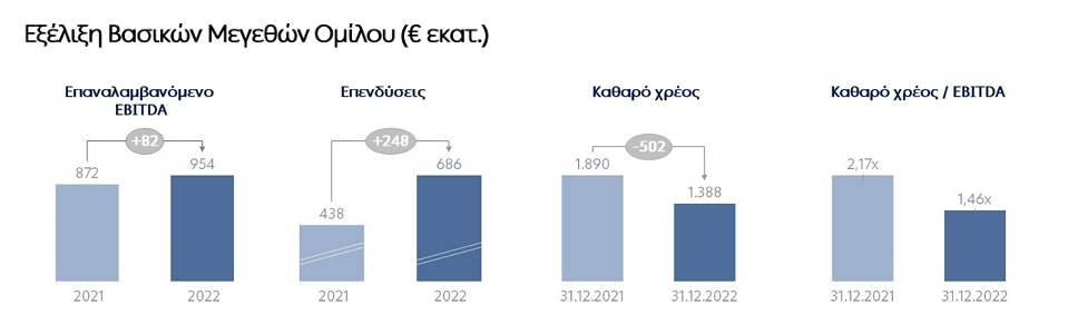 Αυξημένη λειτουργική κερδοφορία για το 2022, παρά τη μεγάλη αύξηση των λειτουργικών δαπανών, και κυρίως των δαπανών για αγορές ενέργειας και για φυσικό αέριο. Συγκεκριμένα, τα κέρδη προ τόκων, φόρων και αποσβέσεων (EBITDA) σε επαναλαμβανόμενη βάση διαμορφώθηκαν σε €953,7 εκατ., αυξημένα κατά €82 εκατ. (9,4%) σε σχέση με το 2021.