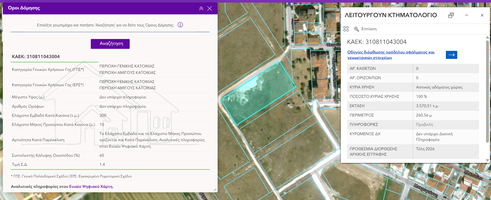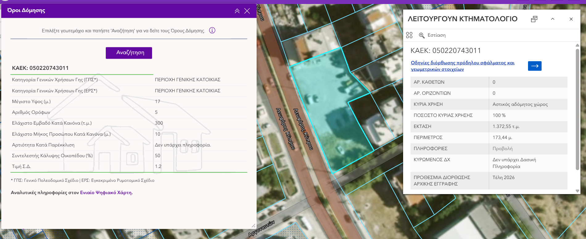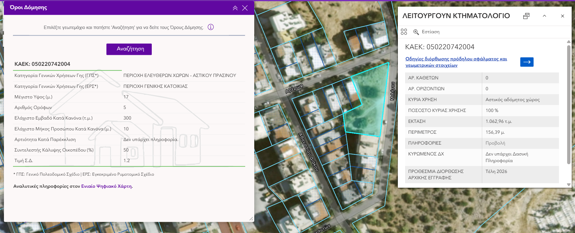 Η εμφάνιση των δεδομένων βασίζεται στη διαθεσιμότητα των πολεοδομικών πληροφοριών στον Ενιαίο Ψηφιακό Χάρτη.