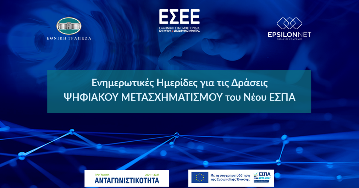 Η Ελληνική Συνομοσπονδία Εμπορίου και Επιχειρηματικότητας (ΕΣΕΕ) και ο Όμιλος EPSILON NET στο πλαίσιο ενεργειών που διεξάγουν με στόχο την ολοκληρωμένη πληροφόρηση για τις δυνατότητες αξιοποίησης αναπτυξιακών προγραμμάτων για την ενίσχυση της ανταγωνιστικότητας των ελληνικών μικρομεσαίων επιχειρήσεων διοργάνωσαν ενημερωτικές ημερίδες σχετικά με την Δέσμη Δράσεων για τον «Ψηφιακό Μετασχηματισμό των ΜμΕ» του Προγράμματος Ανταγωνιστικότητας του νέου ΕΣΠΑ 2021 – 2027.