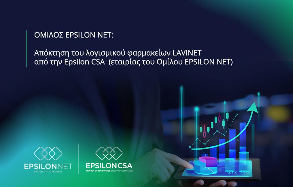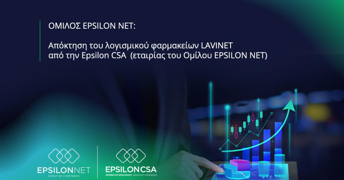 O Όμιλος EPSILON NET ανακοινώνει ότι η εταιρία του Ομίλου και θυγατρική 100% της EPSILON NET AE, εταιρία Epsilon CSA (www.csagreece.com) απέκτησε από την εταιρία LAVISOFT AE, το λογισμικό διαχείρισης φαρμακείων LAVINET έναντι τιμήματος 184.000 Ευρώ.
