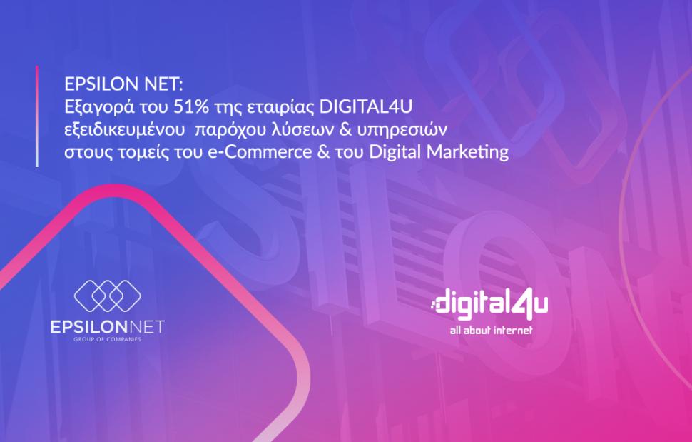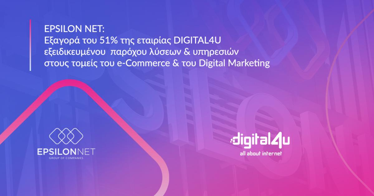 Η EPSILON NET ανακοινώνει την απόκτηση (πλειοψηφικού) ποσοστού 51% στην εταιρία με την επωνυμία «DIGITAL4U ΑΝΩΝΥΜΗ ΕΤΑΙΡΕΙΑ ΠΑΡΟΧΗΣ ΥΠΗΡΕΣΙΩΝ ΔΙΑΔΙΚΤΥΟΥ ΠΛΗΡΟΦΟΡΙΚΗΣ ΚΑΙ ΔΙΑΦΗΜΙΣΗΣ » και το διακριτικό τίτλο «DIGITAL4U» , η οποία δραστηριοποιείται στο χώρο του e-Commerce & Digital marketing (www.digital4u.gr).