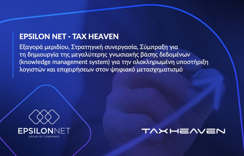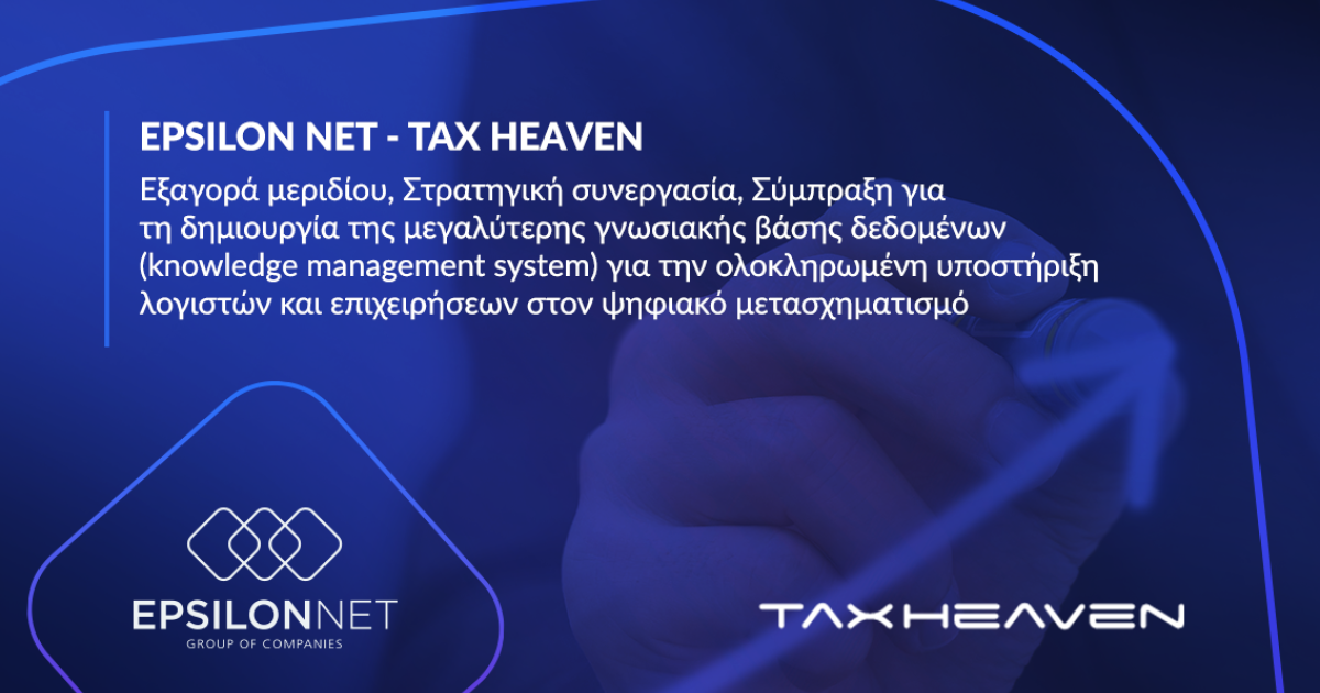 Η σύμπραξη της EPSILON NEΤ και της ΤAXHEAVEN διαμορφώνει τη νέα εποχή στην επιστημονική ενημέρωση και εκπαίδευση χιλιάδων στελεχών του οικονομικού κλάδου παρέχοντας ολοκληρωμένες και προηγμένες υπηρεσίες σε οικονομικά, φορολογικά, λογιστικά, εργατικά, ασφαλιστικά θέματα και αναμένεται με βάση και τις αυξημένες ανάγκες ενημέρωσης που υπάρχουν, να βοηθήσει αποτελεσματικά τις επιχειρήσεις στον ψηφιακό μετασχηματισμό.