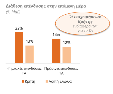 Η διάθεση των επιχειρήσεων για επενδύσεις: Μετά από πολλά χρόνια αδύναμης επενδυτικής δραστηριότητας, το ½ των ΜμΕ δηλώνει ενεργό ενδιαφέρον για αξιοποίηση πόρων του Ταμείου Ανάκαμψης, με την Κρήτη να έχει εντονότερο προσανατολισμό σε πράσινες και ψηφιακές επενδύσεις.