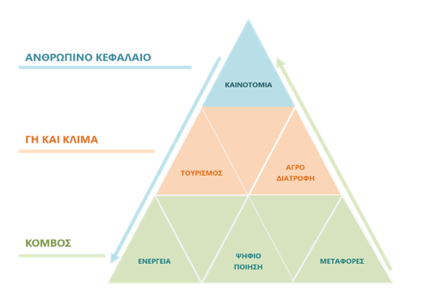 Σχηματοποιώντας την πορεία ανάπτυξης της Κρήτης σε μορφή πυραμίδας, οι κρίσιμες αυτές υποδομές τοποθετούνται στη βάση της και σε αντιστοιχία με τους πυλώνες του Ταμείου Ανάκαμψης κατατάσσονται σε τρεις πυλώνες: