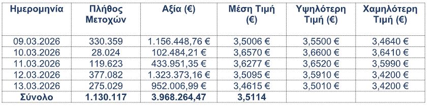 Όπως αναφέρει η ανακοίνωση, η «Τράπεζα Eurobank Ανώνυμη Εταιρεία» (εφεξής η «Eurobank» ή η «Τράπεζα»), σε συνέχεια της από 12.12.2025 ανακοίνωσής της σχετικά με την έναρξη εφαρμογής του Προγράμματος Επαναγοράς Ιδίων Μετοχών («Πρόγραμμα»), το οποίο εγκρίθηκε με την απόφαση της Έκτακτης Γενικής Συνέλευσης των Μετόχων της Τράπεζας στις 22.10.2025, σύμφωνα με το άρθρο 49 του ν. 4548/2018, σε συνέχεια του αντίστοιχου προγράμματος της «Eurobank Ergasias Υπηρεσιών και Συμμετοχών Ανώνυμη Εταιρεία» («Eurobank Holdings») που θεσπίστηκε με την απόφαση της από 30.04.2025 Τακτικής Γενικής Συνέλευσης των Μετόχων της τελευταίας, και σε συνέχεια της από 22.10.2025 απόφασης του Διοικητικού Συμβουλίου της, ενημερώνει το κοινό ότι κατά το διάστημα 09.03.2026 – 13.03.2026 απέκτησε συνολικά, στο πλαίσιο του Προγράμματος, 1.130.117 μετοχές εκδόσεως της ιδίας («Ίδιες Μετοχές») που διαπραγματεύονται στο Χρηματιστήριο Αθηνών («Χ.Α.»), με μέση τιμή κτήσης €3,5114 ανά μετοχή και συνολικό κόστος €3.968.264,47.