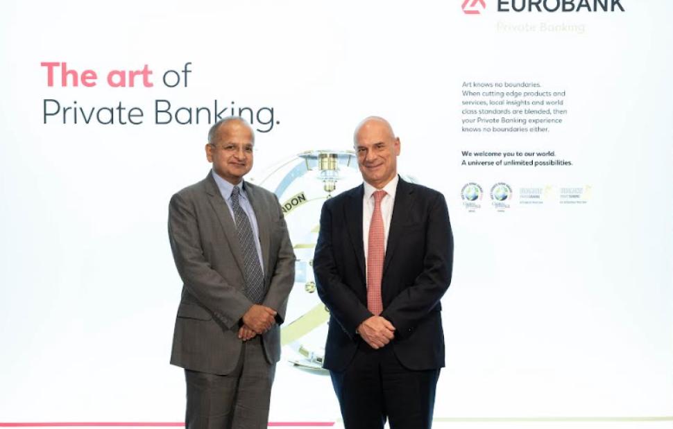 Από αριστερά προς τα δεξιά: Χάρης Χαμπάκης, Διευθύνων Σύμβουλος Eurobank Private Banking Luxembourg & επικεφαλής Group Private Banking Eurobank, Rudrendra Tandon, Πρέσβης της Ινδίας στην Ελλάδα, Σταύρος Ιωάννου, Αναπληρωτής Διευθύνων Σύμβουλος, Group COO & Διεθνείς Δραστηριότητες, Eurobank, Praveen Jagwani, CEO of UTI International , Θεοφάνης Μυλωνάς, Προέδρος & Δ.Σ, Eurobank Asset Management Α.Ε.Δ.Α.Κ.[/caption]