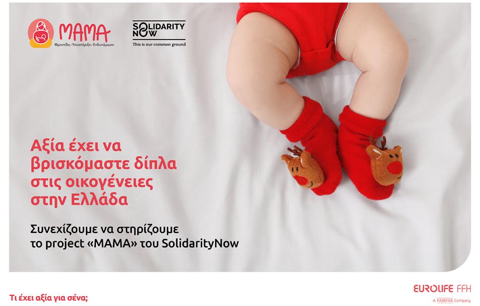 Φέτος τα Χριστούγεννα, η Eurolife FFH ενώνει και πάλι τις δυνάμεις της με το μη κερδοσκοπικό σωματείο SolidarityNow για τη συνέχιση του επιτυχημένου project «ΜΑΜΑ» και για όλο το 2024. Το πρόγραμμα, που ξεκίνησε το 2023 και έτρεξε καθ΄ όλη τη διάρκεια της χρονιάς στη Θεσσαλονίκη, είχε σαν στόχο να υποστηρίξει και να ενδυναμώσει νέες και μέλλουσες μαμάδες από ευάλωτες κοινωνικές ομάδες, προκειμένου να ανταποκριθούν καλύτερα στον νέο ρόλο της ζωής τους. Η πρωτοβουλία αγκαλιάστηκε ιδιαίτερα και οι συμμετοχές ξεπέρασαν το αναμενόμενο, γι΄ αυτό και οι δύο οργανισμοί αποφάσισαν τη συνέχισή του για δεύτερη συνεχή χρονιά.