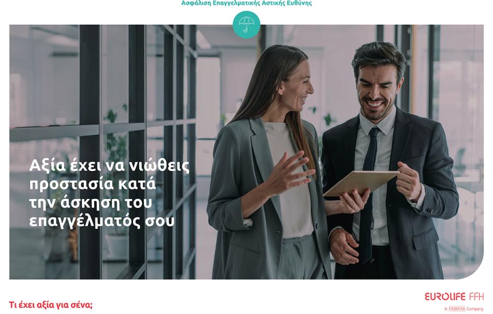 Για τη Eurolife FFH, μέλος της Fairfax Financial Holdings Ltd, αξία έχει να βρίσκεται πάντα στο πλευρό των επαγγελματιών προσφέροντάς τους προϊόντα και υπηρεσίες που τους επιτρέπουν να κάνουν περισσότερα σχέδια για το μέλλον. Στο πλαίσιο αυτό, παρουσιάζει το νέο πρόγραμμα ασφάλισης επαγγελματικής αστικής ευθύνης, προσφέροντας κάλυψη για λάθη ή παραλείψεις έναντι τρίτων που μπορεί να προκύψουν στο πλαίσιο της επαγγελματικής τους δραστηριότητας. Με αυτόν τον τρόπο, έχουν τη σιγουριά και την ασφάλεια που χρειάζονται ότι είναι προστατευμένοι απέναντι σε παραλείψεις που μπορεί να συμβούν κατά την άσκηση της εργασίας τους και μπορεί να προκαλέσουν οικονομική απώλεια, σωματική βλάβη ή/και υλική ζημιά.