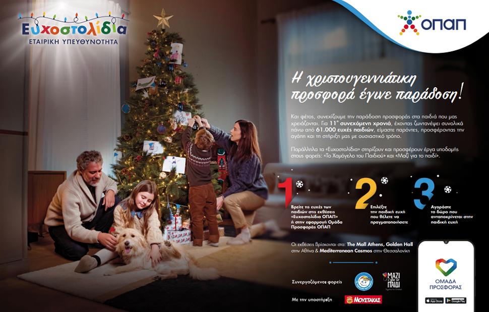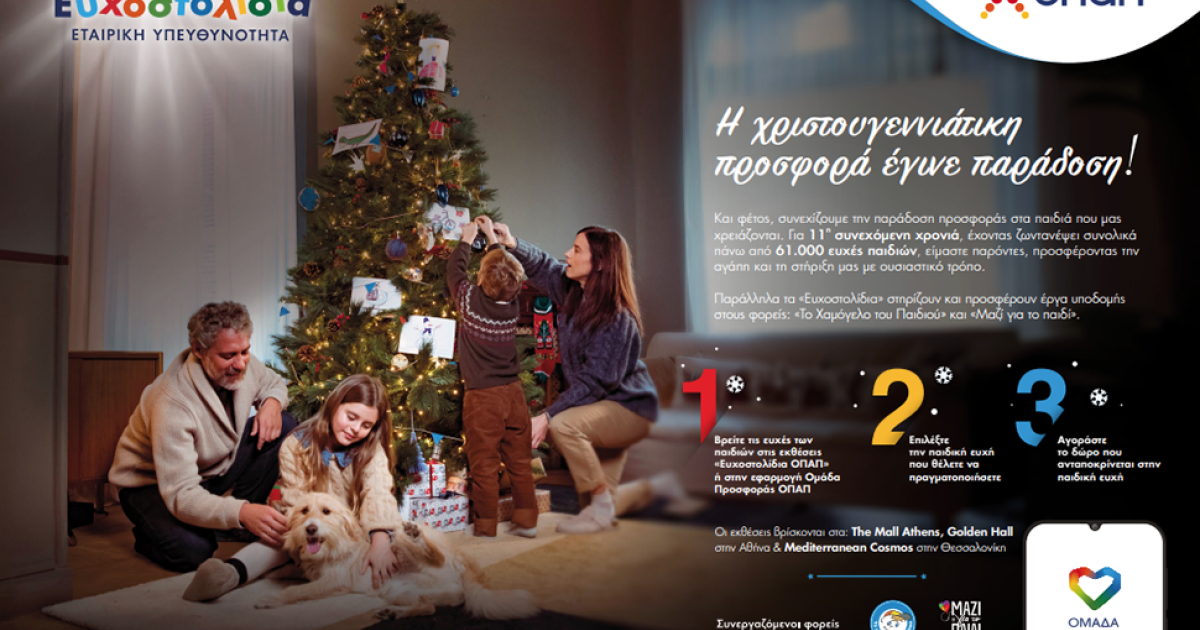 Η αγάπη και η προσφορά παίρνουν τον πρώτο λόγο κι αυτές τις γιορτές για να κάνουν τα Χριστούγεννα χιλιάδων παιδιών πιο φωτεινά. Τα Ευχοστολίδια, η πρωτοβουλία Εταιρικής Υπευθυνότητας του ΟΠΑΠ που έχει κάνει την προσφορά παράδοση τα τελευταία 11 χρόνια, βρίσκονται εφέτος δίπλα στα παιδιά του Οργανισμού «Το Χαμόγελο του Παιδιού» και της ΑΜΚΕ «ΜΑΖΙ ΓΙΑ ΤΟ ΠΑΙΔΙ» και δίνουν σε όλους μας τη δυνατότητα να συνδράμουμε στην πραγματοποίηση των χριστουγεννιάτικων ευχών τους.