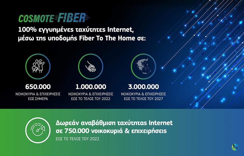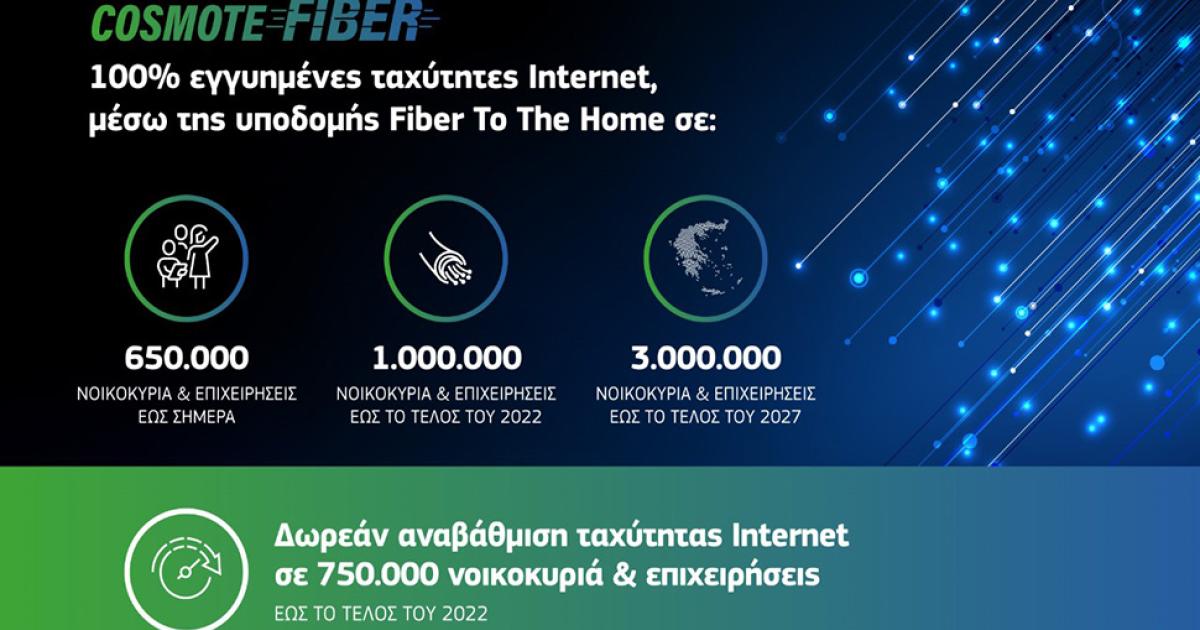 Τις 650.000 έφτασαν τα νοικοκυριά και οι επιχειρήσεις σε όλη την Ελλάδα που έχουν πρόσβαση σε 100% οπτική ίνα μέχρι το σπίτι (FTTH) μέσω του COSMOTE Fiber, του μεγαλύτερου δικτύου οπτικών ινών στη χώρα. Επιταχύνοντας την υλοποίηση του επενδυτικού του πλάνου για την αναβάθμιση της χώρας, που ξεπερνά τα 3 δισ. ευρώ, ο Όμιλος ΟΤΕ προχωρά δυναμικά για να καλύψει περίπου τα 2/3 των γραμμών της χώρας με οπτική ίνα, φέρνοντας το FTTH σε 1 εκατομμύριο νοικοκυριά και επιχειρήσεις μέσα στο 2022, και σε 3 εκατομμύρια μέχρι το 2027. Πρόκειται για τη μεγαλύτερη επένδυση που έχει γίνει τις τελευταίες δεκαετίες στην Ελλάδα για τηλεπικοινωνιακές υποδομές.