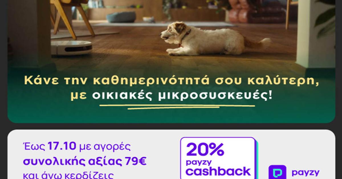 Το 20% της αξίας των αγορών τους σε ευρώ (cashback) κερδίζουν οι καταναλωτές που θα αποκτήσουν στον ΓΕΡΜΑΝΟ οικιακές μικροσυσκευές με payzy by COSMOTE.Η προσφορά ισχύειμέχρι και τις 17 Οκτωβρίου αποκλειστικά για αγορά οικιακών μικροσυσκευών συνολικής αξίας, ανά συναλλαγή, 79€ και άνω,στα φυσικά καταστήματα ΓΕΡΜΑΝΟΣ σε όλη την Ελλάδα ή online στο www.germanos.gr.
