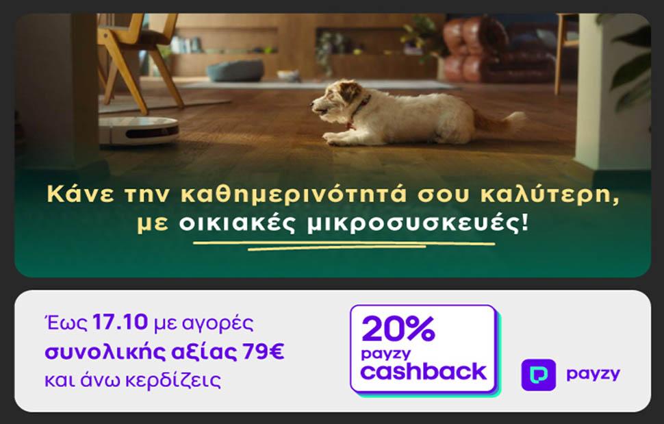 Το 20% της αξίας των αγορών τους σε ευρώ (cashback) κερδίζουν οι καταναλωτές που θα αποκτήσουν στον ΓΕΡΜΑΝΟ οικιακές μικροσυσκευές με payzy by COSMOTE.Η προσφορά ισχύειμέχρι και τις 17 Οκτωβρίου αποκλειστικά για αγορά οικιακών μικροσυσκευών συνολικής αξίας, ανά συναλλαγή, 79€ και άνω,στα φυσικά καταστήματα ΓΕΡΜΑΝΟΣ σε όλη την Ελλάδα ή online στο www.germanos.gr.