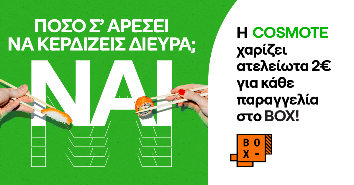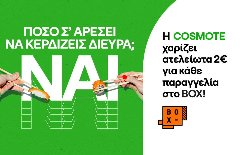 Μέσα από το COSMOTE app, στην ενότητα “FOR YOU”, όλοι oι συνδρομητές της COSMOTE -σταθερής, κινητής, καρτοκινητής- κερδίζουν 2€ έκπτωση από την 1η κιόλας παραγγελία στο BOX, σε κάθε παραγγελία τους από τα χιλιάδες καταστήματα σε όλη την Ελλάδα που συμμετέχουν στην ενέργεια. Κάθε κουπόνι ισχύει για 7 ημέρες, με ελάχιστο ποσό παραγγελίας τα 7,5€. Η έκπτωση ισχύει μόνο με πληρωμή με κάρτα.