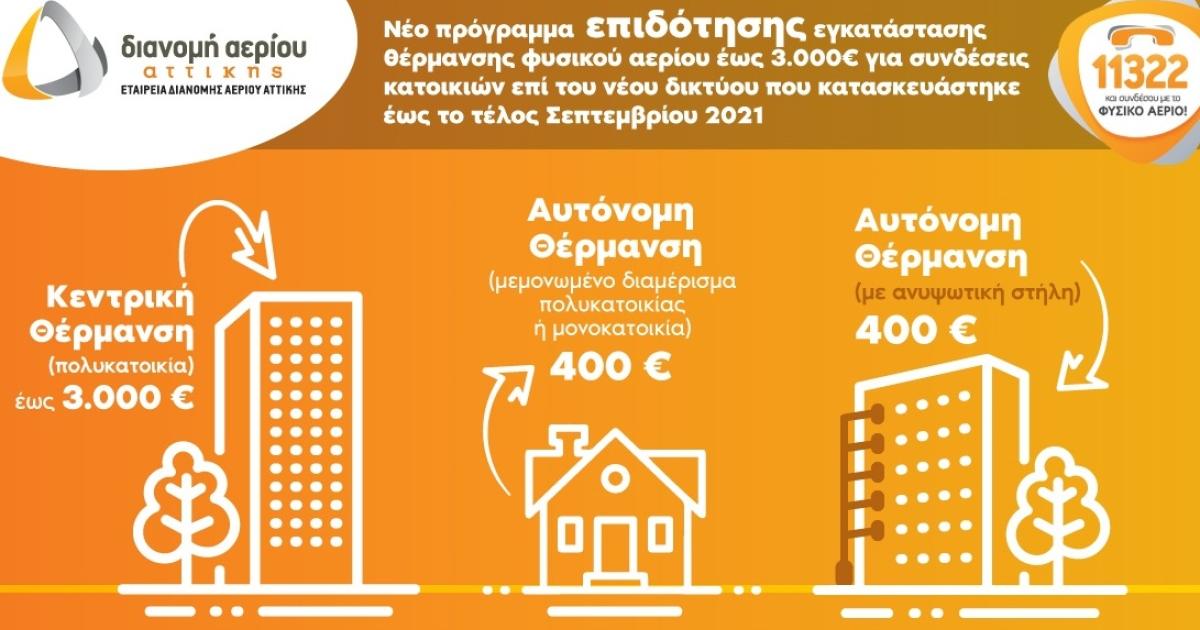 Την τρέχουσα χρονική περίοδο, η ΕΔΑ Αττικής στηρίζει έμπρακτα νέους οικιακούς καταναλωτές, δίνοντας τους τη δυνατότητα να επωφεληθούν από το νέο πρόγραμμα επιδότησης μέρους του κόστους της εγκατάστασης θέρμανσης. Συγκεκριμένα, το νέο πρόγραμμα επιδότησης που βρίσκεται σε εξέλιξη, αφορά νέες συνδέσεις για κεντρικές ή αυτόνομες θερμάνσεις ενεργών κατοικιών, επί του νέου δικτύου φυσικού αερίου που κατασκευάστηκε έως το τέλος Σεπτεμβρίου 2021. Το πρόγραμμα καλύπτει δαπάνες που αφορούν στις συσκευές και τα εξαρτήματα που απαιτούνται για τη μετατροπή της υπάρχουσας εγκατάστασης θέρμανσης άλλης μορφής ενέργειας σε αντίστοιχη χρήσης φυσικού αερίου. Το επιδοτούμενο ποσό είναι 400€ για αυτόνομα συστήματα, ενώ στη περίπτωση κεντρικών θερμάνσεων μπορεί να φθάσει έως τις 3.000€Για περισσότερες πληροφορίες, οι καταναλωτές μπορούν να ανατρέξουν στην ιστοσελίδα της ΕΔΑ Αττικής