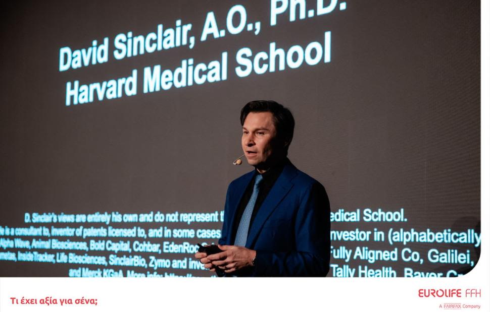 Ο Δρ. David Sinclair είναι Καθηγητής στο Τμήμα Γενετικής της Ιατρικής Σχολής του Χάρβαρντ, στο Ινστιτούτο Blavatnik, ιδρυτικός Διευθυντής του Κέντρου Έρευνας για τη Γήρανση Paul F. Glenn και συν-αρχισυντάκτης του επιστημονικού περιοδικού "Aging". Είναι γνωστός για το έργο του στον έλεγχο της διαδικασίας γήρανσης και θεωρείται ένας από τους πιο επιδραστικούς επιστήμονες παγκοσμίως. Η έρευνά του επικεντρώνεται στην κατανόηση των μηχανισμών της γήρανσης και στην ανακάλυψη μεθόδων για την επιβράδυνση ή ακόμα και την αντιστροφή της. Το πλήθος των καλεσμένων που παρευρέθηκε για να παρακολουθήσει την ομιλία του με τίτλο «Αντιστροφή της γήρανσης στους ανθρώπους: Πόσο κοντά είμαστε;», ενημερώθηκε για τις τελευταίες επιστημονικές εξελίξεις στη βιολογία της γήρανσης και τη σημασία της υγιούς διαβίωσης. Ο διακεκριμένος γενετιστής τόνισε τη σημασία της πρόληψης και μοιράστηκε με το κοινό πρακτικές συμβουλές για έναν τρόπο ζωής που μπορεί να συμβάλει στη μακροζωία, ανεξαρτήτως κοινωνικοοικονομικής κατάστασης.