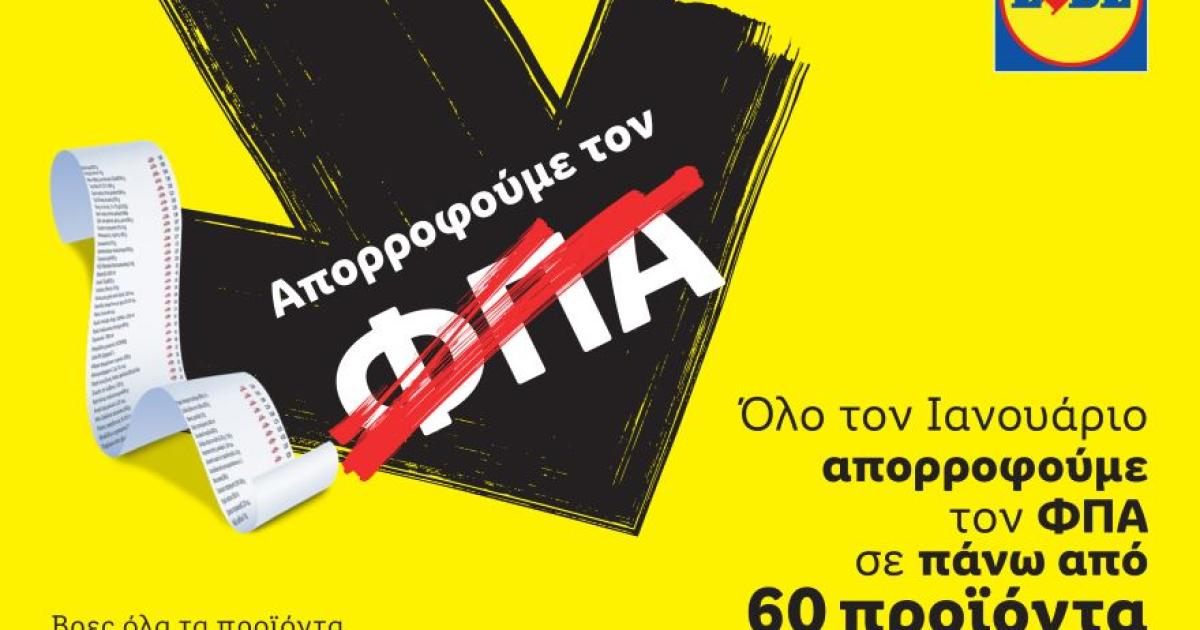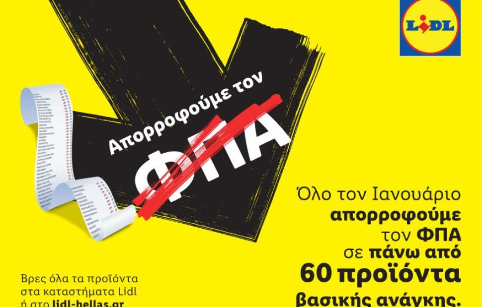 Κάθε νέα χρονιά ξεκινά με χαρά, αισιοδοξία, ελπίδα, αλλά και τις βασικές ανάγκες του νοικοκυριού, που δεν μπορούν και δεν πρέπει να περιμένουν. Γι’ αυτό και η Lidl Ελλάς με στόχο τη στήριξη του Έλληνα καταναλωτή την απαιτητική περίοδο μετά τις γιορτές, προχωρά σε απορρόφηση του Φόρου Προστιθέμενης Αξίας (ΦΠΑ) σε περισσότερα από 60 είδη βασικής ανάγκης μέχρι το τέλος Ιανουαρίου, προσφέροντας κορυφαίας ποιότητας προϊόντα σε πραγματικά χαμηλές τιμές.