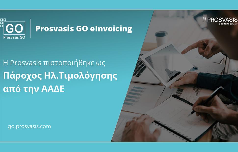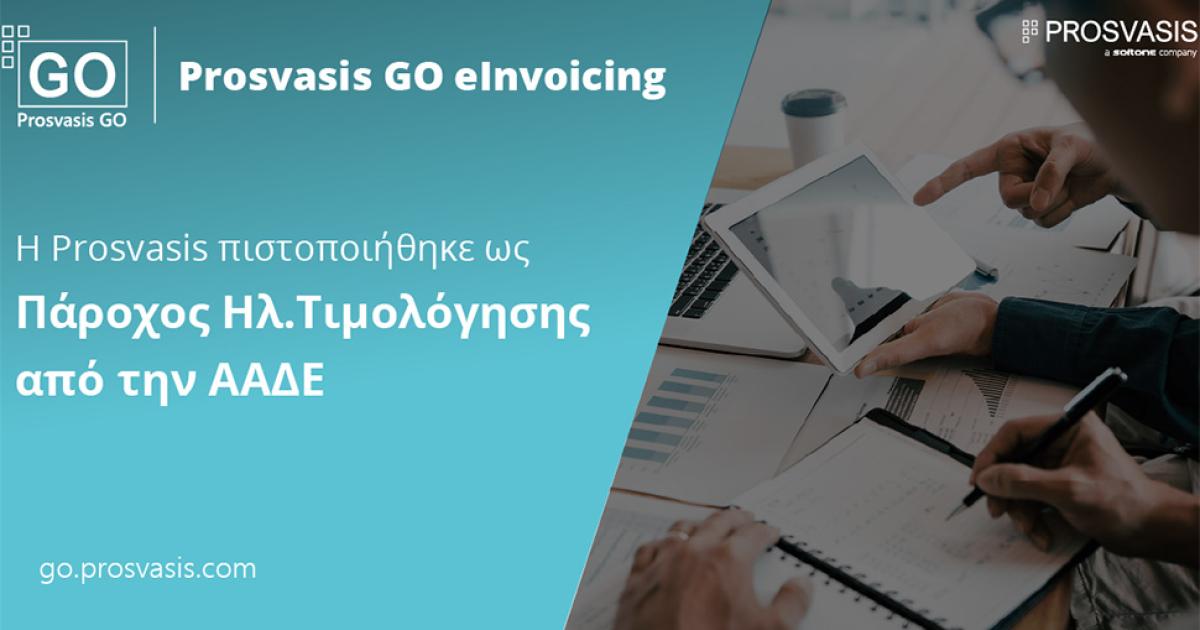 Η Prosvasis, μέλος του Ομίλου Εταιρειών SOFTONE, πιστοποιήθηκε από την Ανεξάρτητη Αρχή Δημοσίων Εσόδων (ΑΑΔΕ) ως «Πάροχος Υπηρεσιών Έκδοσης Ηλεκτρονικών Στοιχείων» (ΥΠΑΗΕΣ), λαμβάνοντας άδεια καταλληλότητας για τη λύση ηλεκτρονικής τιμολόγησης Prosvasis GO Εinvoicing, δυνατότητα που μπορεί να προστεθεί στις συνδρομητικές εκδόσεις της πρωτοποριακής online εφαρμογής Prosvasis GO και μάλιστα με τη χαμηλότερη τιμή ανά τιμολόγιο, της αγοράς.