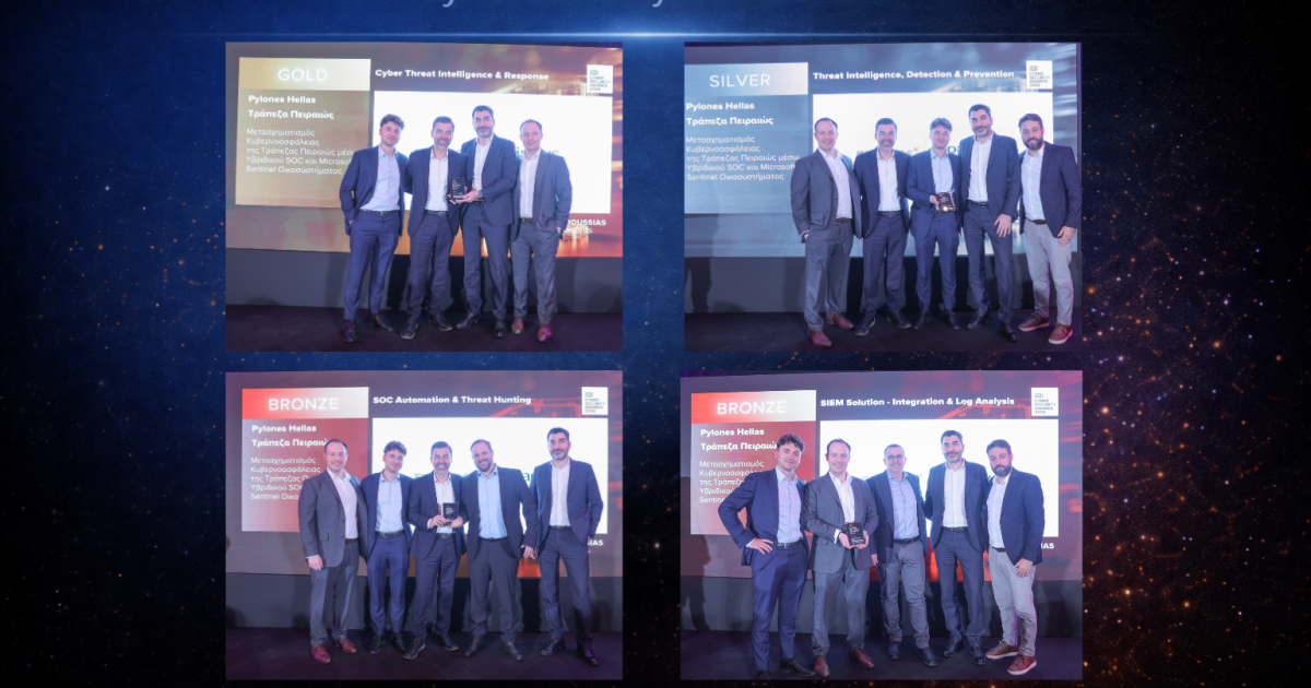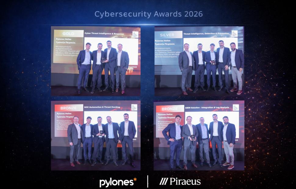 Η Pylones Hellas διακρίθηκε στα Cyber Security Awards 2026, που διοργανώθηκαν από την Boussias Communications, αποσπώντας τέσσερα σημαντικά βραβεία για το έργο μετασχηματισμού κυβερνοασφάλειας που υλοποίησε για την Τράπεζα Πειραιώς, μέσω ενός Υβριδικού SOC και Microsoft Sentinel οικοσυστήματος.